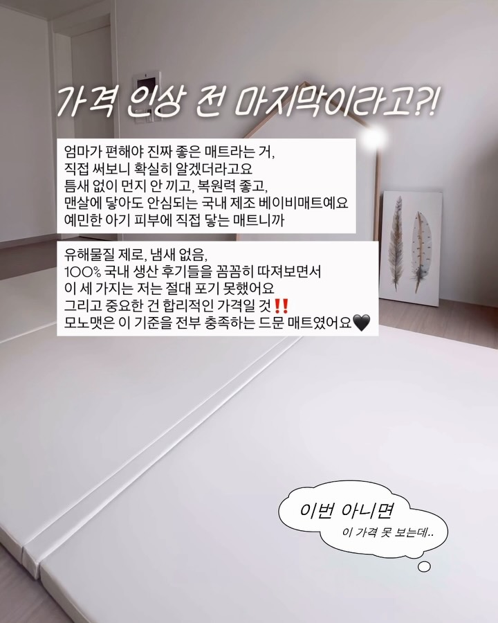 댓글로 모노맷 남겨주세요🖤모노맷은 니나 단독공구입니다👀🙌🏻 #모노맷모노핏동시진행중 📌 가격 인상전 마지막 공구입니다⏰ 매트 고민하셨다면 이번 공구는 놓치지마세요‼️ 벌써 9차로 보여드리는 모노맷 폴더매트!!!!!👶🏻 이번엔 최초로 클린매트 + 맞춤매트 모노핏까지 함께 진행합니다 댓글로 ‘모노맷’라고 남겨주세요❤️🔥 지금 바로 최저가 구매링크 보내드릴게요✍🏻 ___________________________________ 여러 매트 종류가 많지만, 저는 거실 마루바닥 청소가 쉬운 걸 선호해서 신생아때부터 폴더매트를 6년 동안 써왔어요 처음 니니를 낳고는 비싼 매트를 사봤었는데 윗면이 갈라져있는 폴더매트라 매번 틈새로 끼고 복원력도 좋지않아 자국, 들뜸 심해서 결국 다 버리고 중간에 한 번 싹 바꿔야 했거든요ㅠㅠ 그래서 진짜 이게 마지막 매트다!!!!! 라는 생각으로 광고가 아닌 실제 몇 년 사용 후기를 하나하나 꼼꼼히 따져보고 고른 매트가 바로 모노맷이에요✨🤍 써보니 가격 대비 퀄리티가 너무 좋아서 친구며 출산한 지인이며 만나는 사람마다ㅋㅋㅋㅋ 마구 추천하고 다녔어요💪🏻 벌써 올해 아이가 7살………… 직접 써보니 매트 살 때 가장 중요한 건 일단 엄마가 편해야 한다는 거예요! 모노맷 매트는 틈새 없는 구조라서 먼지가 끼지 않아 청소가 편하고, 아이들 맨살이 닿아도 더 안심할 수 있는 베이비매트랍니다 층간소음에 최적화된 4cm 두께감까지 확실해요‼️‼️ 1차부터 8차까지 공구 후기들도 그렇고, 정말 매일 만족하면서 일상에서 쓰고 있어서 지금까지 진행한 공구 중에서도 모노맷은 자신 있는 제품입니다👍🏻 비슷한 매트 이것저것 다 비교해보고 고른 건 다 이유가 있죠🥇 어떤 매트 살지 고민되시는 분들, 이제 고민 그만🙅🏻♀️ 정말 합리적인 가격, 국산 고퀄리티 모노맷으로 이번 기회에 바꿔보세요🖤 - 📌모노맷 클린매트 2,3단📌 ☑️ 클린 2단 100x200 🔜공구가 무료배송 95,000원 120x200 🔜공구가 무료배송 105,000원 140x200 🔜공구가 무료배송 115,000원 ☑️ 클린3단 100x300 🔜공구가 무료배송 125,000원 120x300 🔜공구가 무료배송 135,000원 140x300 🔜공구가 무료배송 145,000원 160x300 🔜공구가 무료배송 195,000원 ___________________________________ 혹시 설치하는 곳 사이즈나 더 궁금하신 점 있으시다면 언제든 편하게 DM과 댓글 주세요!!!!!🙋🏻 우리 아이들의 추억이 담긴 공간, 이제는 모노맷과 함께 만들어보세요🤎 ⠀ ⠀