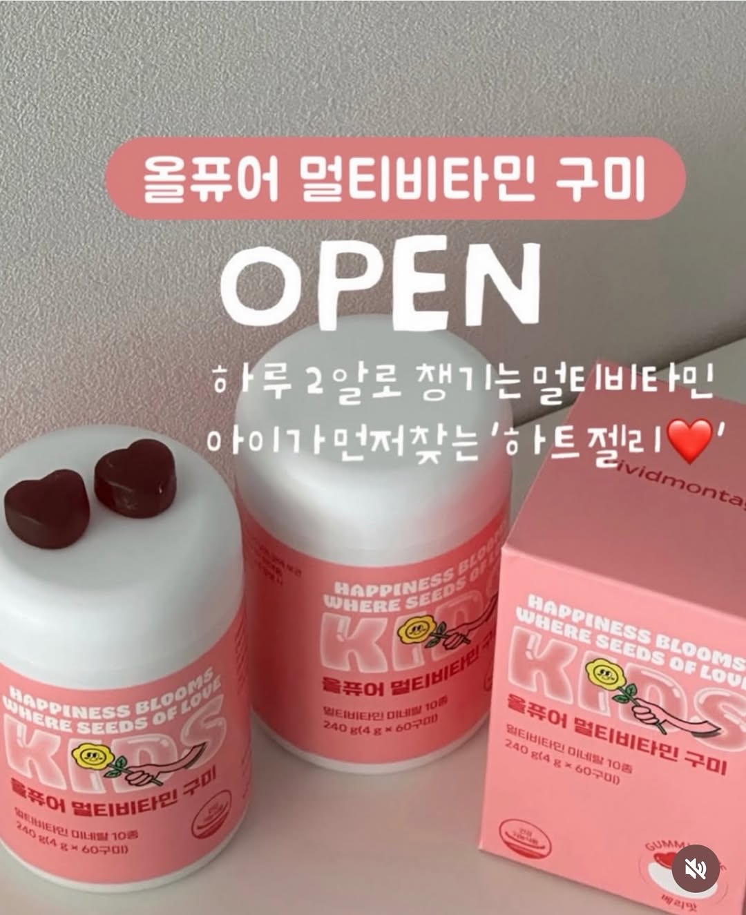 #잠시후오전10시 #구매인증여기에 첨가물❌ 하트젤리 우리아기 하루2알 올퓨어멀티비타민 OPEN 잠시후 오전10시오픈됩니다 📩댓글에 ‘링크‘ 댓글남겨주시면 구매링크 보내드릴게요 🖤구매완료+전화번호 뒷네자리 남겨주세요 추첨을통해 네이버페이 1만원권 보내드릴게요! 🆕올퓨어칼슘구미 함께 진행해요! ⭐️3박스이상 구매 선착순 30명 블룸캔디증정 하트젤리뭐에요? 질문 정말 많았는데! 자일리톨 덴티큐브와 같은 회사제품 맞구요 ! 그냥 아무 회사에서 만든제품이 아닌, 비타민D 유명한 제약회사에서 만들었어요 ️♥️약국입점멀티비타민 ♥️ 화학첨가물 일절 들지않은 멀티비타민 구미입니다 비선호첨가물(스테아린산,합성향료,부향제, 이산화규소)X 유전자 변형 농산물 사용X 진짜 건강한 멀티비타민 구미 ! ✅ 시중 키즈 비타민제품들 중에 제일 필수영양소 함량이 높고, 성분 원료까지 깐깐하게 골라만든 제품이며 출시후 약국에 먼저 판매된 제품이에요 ! 하루에 정말 2-50건 정도 공구제안이 쏟아지고 그안에 멀티비타민 제안도 무수히 많았지만, 첨가물 덩어리 또는 성분 , 원료, 다 따져보니 적합한 제품 하나없었습니다 ! 제가 여태 ‘영양제’ 공구안한 이유중 하나! 아이들에게 믿고 먹일만한게 없다 였지만 그 생각을 단박에 깨준 제품이에요 📌멀티비타민 구매하실때 꼭 확인해보세요 -화학첨가물, 맛과 색을 내기위한 설탕 인공색소등 들어가있지 않은지 -같은 영양소가 들어가있어도 어떤원료로 만들었는지 -1일 기준치 영양성분표 함량 비교도 꼭 ! 3-5세 1일 기준치 함량보다 더 많이 들어가있고 체내 흡수되고 나서 나머지는 쉬야로 나옵니다 처음 먹일때 쉬보고 놀랐어요 진짜 비타민 먹은쉬🥹 ❤️올퓨어 멀티비타민은요 베리맛으로 잘먹기도 잘먹지만 무엇보다 하루 2알로 다른 비타민 영양제 추가 없이 면역에 좋다는 비타민C, 아연, 비타민D 등 모두 챙겨줄수 있어요 면역, 뼈건강, 활력, 항산화 등 필요한 성분은다 갖춘제품 정말 유명한 웬만한 키즈영양제들보다도 영양성분이나 원료가 더 좋다는점! 성분, 원료, 첨가물 걱정없이 오래먹일 제품 찾는게 먼저였기에 꼭 여러분께 보여주고 싶었어요 ✅ 섭취연령: 18개월 아기부터 하루 2알씩 추천드리지만 , 15-18개월 사이의 아기들 경우 하루 1알 잘라서 주셔도 되셔요 ❤️ ✅엄마도 같이 드셔도 좋고 임산부경우 임산부에게 유해한 성분이 들어가있진 않으나, 주치의에게 상담후 드시는것을 추천합니다 ✅옵션 3박스부터 무료배송 1통 60ea 한달치라 생각해주세요 공구 3달텀으로 3박스 옵션 추천드려요 ❤️ ✔️16중 기능성 멀티비타민 ✔️ 화학첨가물 X ✔️ 전성분 GMO-FREE ✔️ 체내 흡수율을 고려한 원료선정 ✔️ 설탕 대신 건강한 프락토올리고당 사용 ✔️ 베리류로 상큼한 맛 하트모양구미 ✔️HACCP 인증시설 제조 또, 비타민D 전문제조 제약회사에서 만들어진 멀티비타민이라 더어욱 믿음이 가요 ❤️ 🏷️ 4/20월 오전10시오픈 -4/27월 낮12시마감 ✅ 평일 12시이전 주문건 당일출고 배송지에 따라 2~3일정도 택배기간 소요될수있습니다 ❤️선착순 이벤트와 구매완료이벤트 놓치지마세요