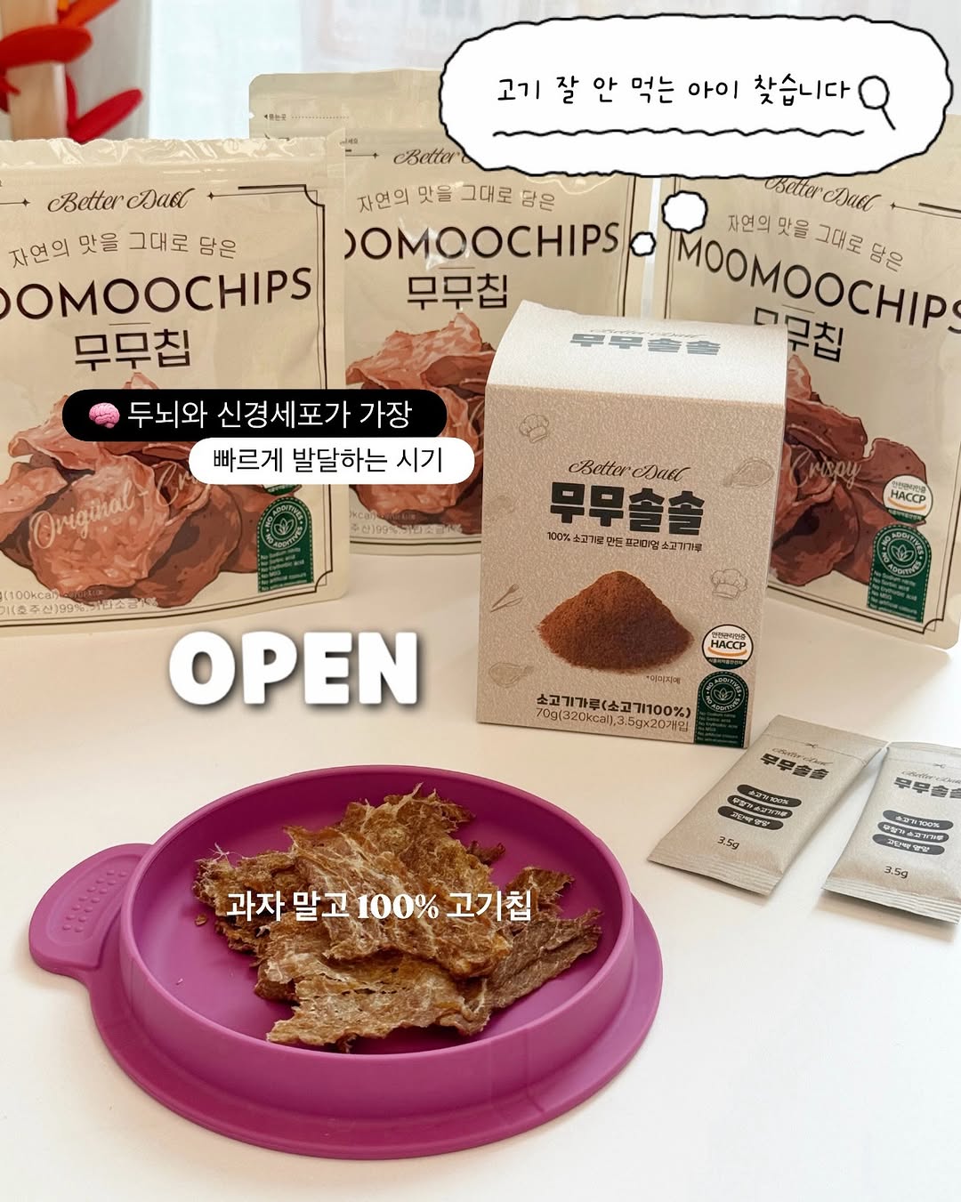 무무칩은 바삭하고 얇아 아이와 어른 모두 좋아하는 건강한 간식입니다. 소고기칩과 소고기 가루로 구성되어 있어, 까다로운 입맛을 가진 아이도 잘 먹습니다.