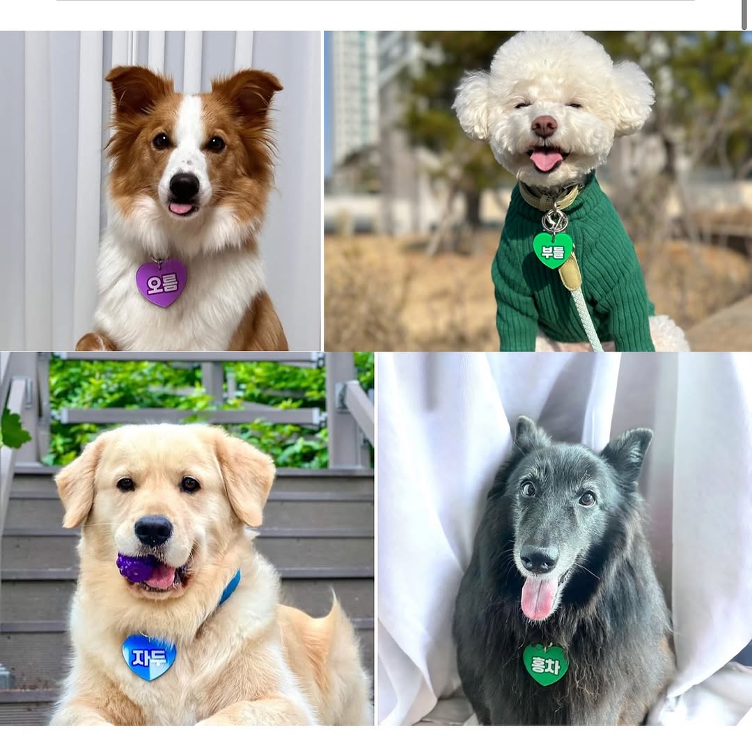 오랜만에 온 인식표 공구가 1+1 이라니 이건 못 참죠? 하트 인식표는 두가지 사이즈에요 작은하트, 큰하트 둘 다 너무너무 귀여워요 큰 인식표는 멀리서도 잘 보이고 큰 댕댕이들한테 넘 귀여워요 큰거보다 작은게 좋은분들은 작은사이즈도 엄청 귀엽답니다 뒷면에는 보호자 정보 적을 수 있어요 이쁜 인식표 색상으로 골라보세요❤️ 전 이번엔 파스텔톤이 예뻐서 파스텔로 했는데 사진은 정말 쨍한게 이쁘게 나오긴 해요! 근데 정말 다 예뻐서 못 고름../ㅅ/ 목줄이나 하네스랑 깔맞춤도 완전 예뻐요
