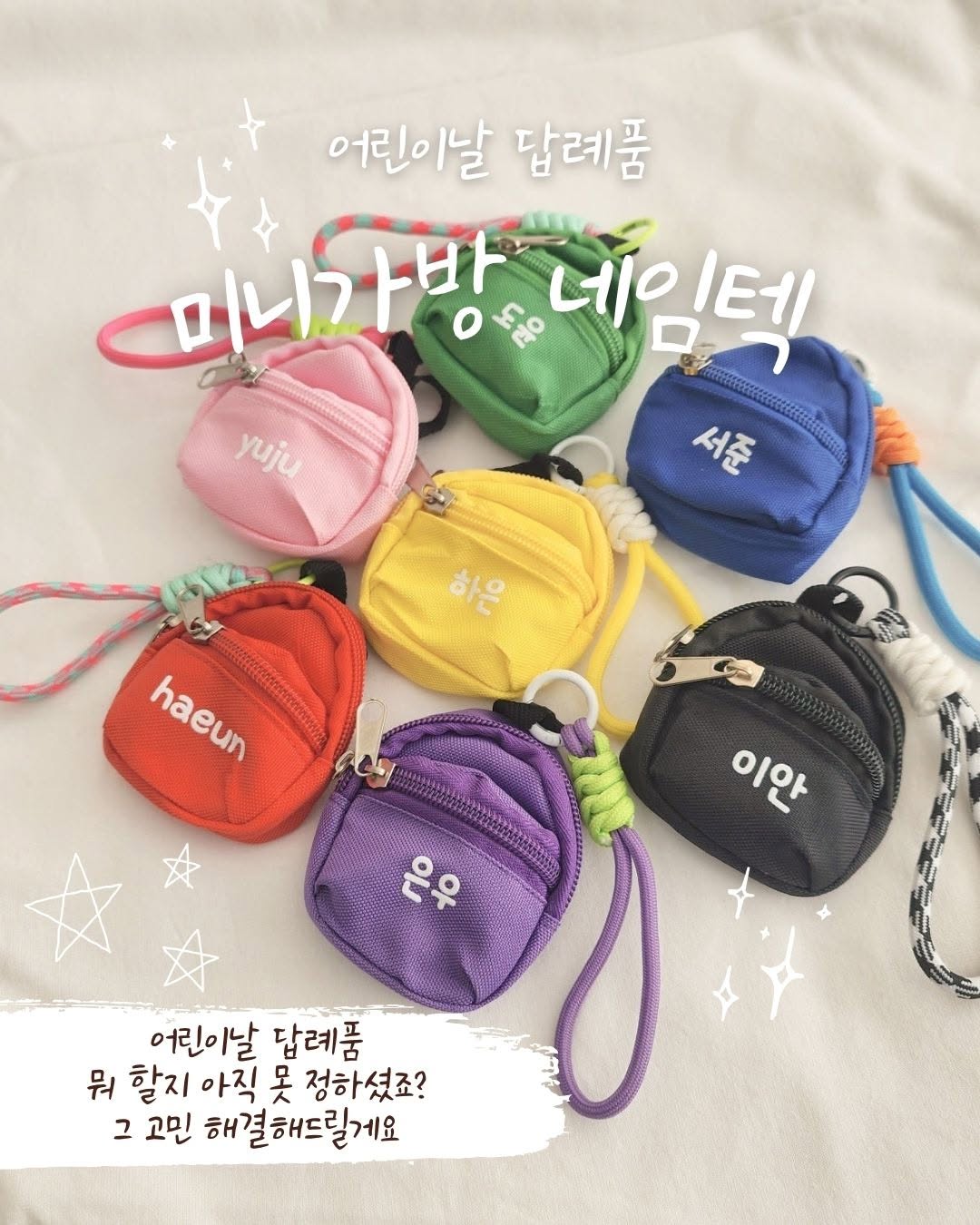 어린이날 답례품으로 적합한 미니가방 네임텍입니다. 실용적이고 귀여운 디자인으로 아이들에게 인기가 많습니다. 최소 5개 이상 주문 가능하며, 로프키링과 포장비닐 지퍼백이 포함됩니다.