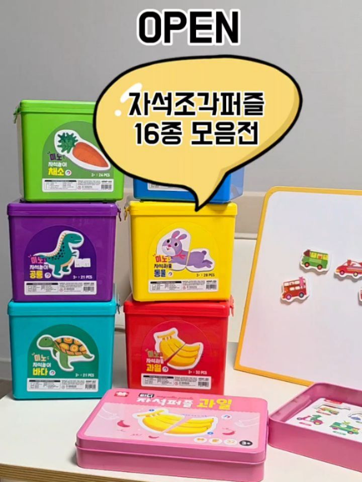 #공구오픈 🗓3월 24일 오전 10시 오픈🗓 🩷국내생산 아리아띠 자석퍼즐놀이 최저가 모음전🩷 ✨️총 16종 골라담기✨️ 🚨링크 필요하신분들은 댓글에 '링크'적어주세요🚨 🚨오픈시, 자동화 DM으로 구매 링크 전송됩니다🚨 - 하원하고 집에서 뭐하고 놀아줄까?👀 한번쯤 생각해보신 분들 있으시죠 ! 그래서 제가 가져왔습니다! 의미 없는 장난감말고, 이왕이면 이런걸로 놀아주세요. 📚놀이+학습📚 동시 가능한 ✨️조각퍼즐놀이✨️ - 조각퍼즐놀이는 단순한 놀이가 아니에요.❌️ 뇌·손·집중력까지 한 번에 자극되는 놀이에요. 두뇌 + 손 + 집중력 + 언어까지 영향을 주는 ⭐️조각 퍼즐 놀이⭐️ - 조각퍼즐놀이는 보통 돌전후로 많이 들이세요 ! 한조각 퍼즐, 두조각 퍼즐, 많게는 세조각 퍼즐까지 다양한데요. 시중에 나왔던 제품들이 살짝 아쉬운 부분들이 잇었는데.. 찾다가 발견한 아리아띠 조각퍼즐놀이 제가 왜 이 상품을 추천드리는 지 자세히 알려드릴게요.👀 ⬇️⬇️⬇️⬇️⬇️⬇️⬇️⬇️⬇️ 📢아리아띠 제품이 좋은점📢 다른 조각퍼즐과 다르게 뒷면이 자석이에요 ! 퍼즐놀이+자석놀이를 한번에 🙋♀️ - 큼지막한 자석 사이즈로 아기가 잡기 쉽고 안전해요 !🙂 폭신폭신한 EVA 소재,라운드처리되어 안전하고, 물에 닿아도 OK!👌 - ✅️소근육발달 ✅️집중력 향상 ✅️두뇌 발달 ✅️인지 능력 UP ✅️어휘력 UP - 한조각은 단순 붙이기라면, 두조각은 생각하며 완성하는 과정이에요 이 좋은걸 안할이유가 없다..🙋♀️ 조각 맞추기만 하기 아쉬웠는데..? 하셨더 분들은 잘 찾아오셨습니다ㅎㅎ - 그리고, 또 하나 추천드리는 이유! 아리아띠 제품이 정말 좋은게 ✨️테마 배경지✨️가 들어있어서 다양하게 놀 수 있어요 ! ✅️상상력 UP ✅️창의력 UP 틴케이스에 착착붙는 자석퍼즐 이런건 처음 보시죠?👀 - ✨️전용 박스✨️까지 드리니깐정리까지 깔끔하게 해주세요 ! 가격도 너무 착해!❤️ 🔥1만원초반대🔥 - 📌구성📌 ✅️전용박스 제품 👉 미노 (자석퍼즐 + 박스) ✅️틴케이스 제품 👉 티니 (자석퍼즐 + 틴케이스 + 배경카드 4장 + 그림자 카드 2장) - 📌총 16종📌 ✅️한조각/두조각 ✅️과일/동물/채소/바다/공룡 📌라인업📌 📌미노 한조각(6종) : 탈것/동물/과일/공룡/채소/바다 📌미노 두조각(4종) : 탈것/동물/과일/공룡 📌티니 한조각(3종) : 동물/바다/탈것 📌티니 두조각(3종) : 과일/동물/탈것 자석판 구매가능해요! 틴케이스는 핑크가 아닌 흰색으로 출고됩니다🙂 - 📌 공구일정 📌 3월 24~26일 📌 공구가격 📌 ✅️티니 조각퍼즐 👉정가 : 25,000원 👉공구가 : 10,500원 (틴케이스 제품)⭕️ ✅️미노 조각퍼즐 👉정가 : 25,000원 👉공구가 : 13,000원 (보관박스 제품)⭕️ ✅️추가옵션 👉자석판 : 9,900원 ✔️30,000원이상 무료배송 ✔️평일 기준 오전 11시이전 주문건 당일 출고 ✔️제주 및 도서산간지역 택배비 추가 ✔️브랜드 or 택배사 사정에 따라 출고일 1-3일 지연 가능성 있음 - 📌구매링크📌 프로필링크 참고해주세요! 📌구매인증 이벤트📌 댓글에 '구매완료/폰뒷자리' 적어주세요! 총 N분 추첨통해 🎁네이버페이 5,000원🎁 선물드릴게요!