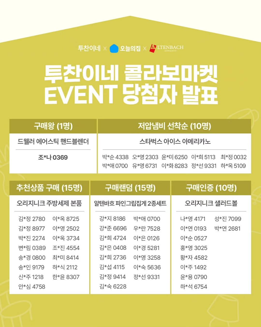 오늘의집 콜라보마켓 당첨자 확인하셔요♡ 사은품은 익일 출고될 예정입니다~! 2월에 있었던 알텐바흐 저압냄비 공구건입니다. . 그리고 이번달에 예정 되어 있던 마켓컬리 공구 상품이 변경되어 알려드려요 . 알텐바흐 디펜더스s 생산이 지연되어 24팬과 웍, 28팬과 웍이 제외되고 스퀘어팬과 브런치팬,크레페팬, 그리고 저압냄비와 멀티케셀, 멀티쿠커만 진행하게 되었습니다. . 기다리고 계신분들 많으실텐데 죄송해요🙏 입고되면 공구와 상관 없이 구매하실 수 있도록 도와드릴게요♡ 오늘도 좋은 하루 되세요!!