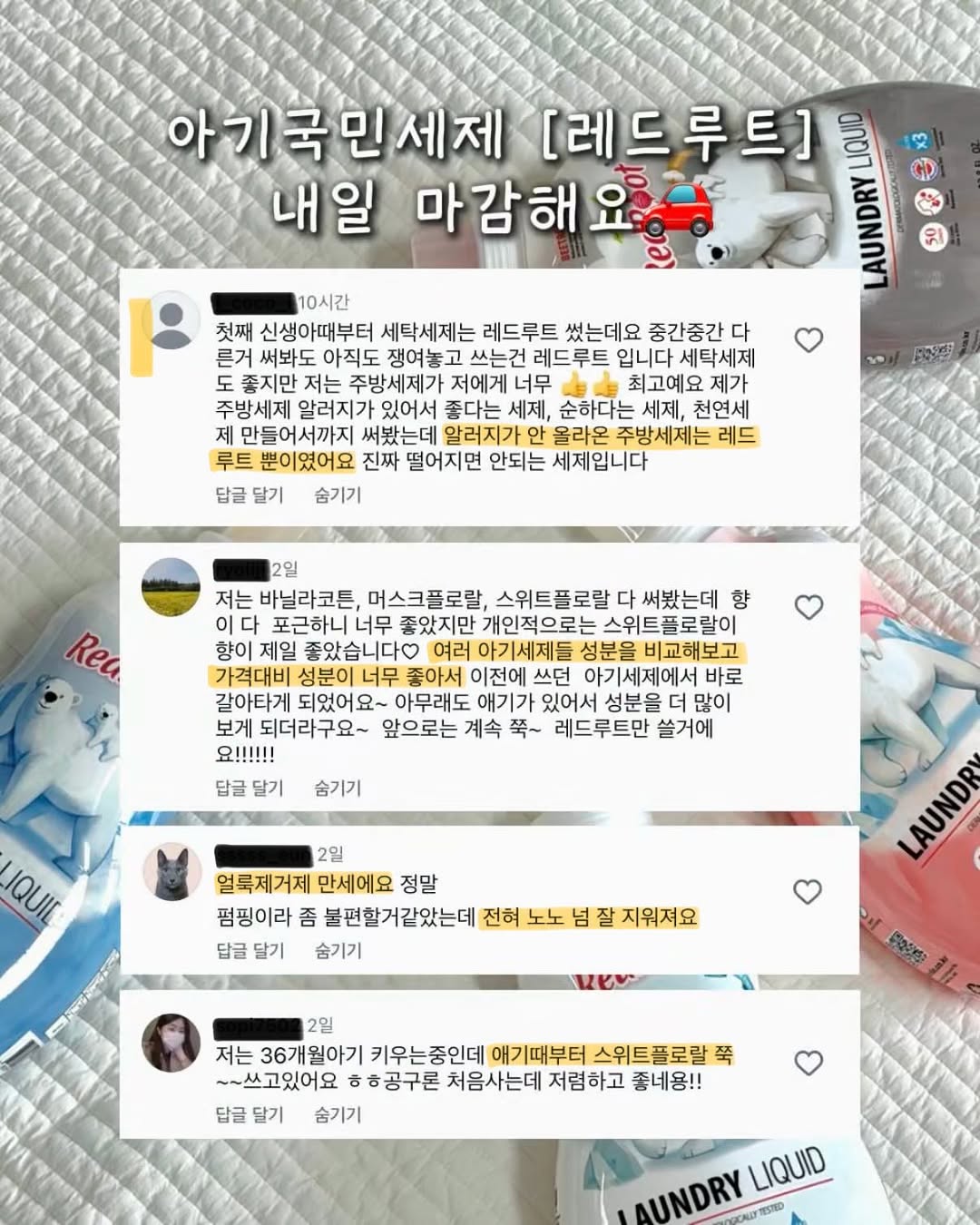 #마감임박 [링크]남겨주시면 최저가링크 보내드려요! 오픈 첫날부터 많이들 찾아주셔서 감사해요♥️ [레드루트]는 내일 자정에 칼마감 예정이라는점 참고부탁드려요! 소비기한 넉넉하게 챙겨왔으니 이번 핫딜 때 꼭 쟁여두세욧! 다음에 또 공구로 가져올 수 있을지 미정이에요😭 ——————————————— 💰초특가 혜택, 놓치면 후회해요! 인기 1순위 [세탁세제 3개 + 유연제 3개]세트 구성을 인터넷 최저가랑 비교해보면 약 2만 원 차이! 공구가 58,900원은 진짜 놓치면 후회할 가격이에요✨ ⭐️ 실시간 인기 순위 TOP 4 1️⃣ 세탁세제 3개 + 유연제 3개 (가장 많이 쟁이시는 구성!) 2️⃣ 건조기시트 3개 (유연제랑 같이 쓰면 향기 대폭발!) 3️⃣ 세탁세제 3개 or 유연제 3개 (단품 집중 공략!) 4️⃣ 캡슐세제 2개 (간편함 끝판왕!) ——————————————— 와! 레드루트를 공구로 만나볼 수 있다니✨ 아이 키우는 집이라면 모르는 분이 없죠? 신생아 때부터 믿고 쓰는 [국민아기세제]로 워낙 유명하죠! 저도 오랫동안 레드루트를 쭉 사용해온 찐팬으로서 여러분께 좋은 혜택으로 소개해 드릴 수 있어 정말 뿌듯하고 설레는데, 무조건 쟁여두셔야 해요🔥 4인 가족인 저희 집은 아이 빨래와 어른 빨래를 나누는데 일주일에 무려 5번 이상 세탁기를 돌려요…! 이렇게 자주 쓰는 세제, 제가 왜 레드루트에 정착했는지 그 이유를 꼼꼼하게 정리해 드릴게요👀 ——————————————— 🙋🏻♀️ 레드루트 세제, 아기엄마들이 왜 열광할까요? ✅ 전 성분 100% 투명 공개 세제는 전성분을 공개 의무가 없지만, 레드루트는 숨김없이 전성분을 다 보여주는데 그만큼 성분에 자신 있다는 뜻이죠! ✅ 에코서트(ECO-CERT) 인증 세계적인 유기농인증기관이 인정한 [자연유래 식물성분]으로, 예민한 우리아기 피부에도 자극 걱정 없어요! ✅ 유해물질 철저 배제 가습기 살균제 성분(CMIT/MIT)은 물론 알러지 유발 향료, 형광증백제, 색소, 산화방지제까지 걱정되는 성분은 싹 뺐습니다❌ ➕ 성조숙증 유발 5대 물질 배제로 안심 특히, 아이 키우는 엄마들이라면 꼭 체크해야 할 부분! 프탈레이트, 갈락소라이드, 토날라이드, 비스페놀 A, 파라벤 등 성조숙증을 유발하는 5대 물질까지 배제해 신생아부터 쭉 안심하고 사용할 수 있어요👶🏻 ✅ 강력한 7종 복합 효소 단순하게 성분이 순하기만 한 게 아니에요! 보통 아기 세제는 순해서 세척력이 약하다는 편견이 있죠? 레드루트는 비트 추출물 발효 성분과 7종 복합 효소가 들어있어 분유, 침, 이유식, 과일, 전분, 소스 등 아기 빨래에서 자주 나오는 각각 다른 얼룩들을 효과적으로 분해해 세척력까지 완벽해요👏🏻 ——————————————— 얼마전에 출시한 신제품 [캡슐 세제]도 준비했어요! ▪️4kg 기준 캡슐세제 한알이면 끝! ▪️계량 고민 없고 잔여물 걱정 없는 수용성 필름 ▪️은은한 바닐라 코튼향 & 무향 선택 가능 그외에도 섬유유연제, 젖병세제, 주방세제 그리고 얼룩제거제, 산소계 표백제, 건조기시트까지 알차게 준비했으니 쏙쏙 골라담아가세요♥️ 자주 쓰는 생필품일수록 가장 저렴할 때 두둑하게 쟁여야지 이득인거 다들 알고 계시죠? 초특가로 생활창고 든든하게 채워보세요!