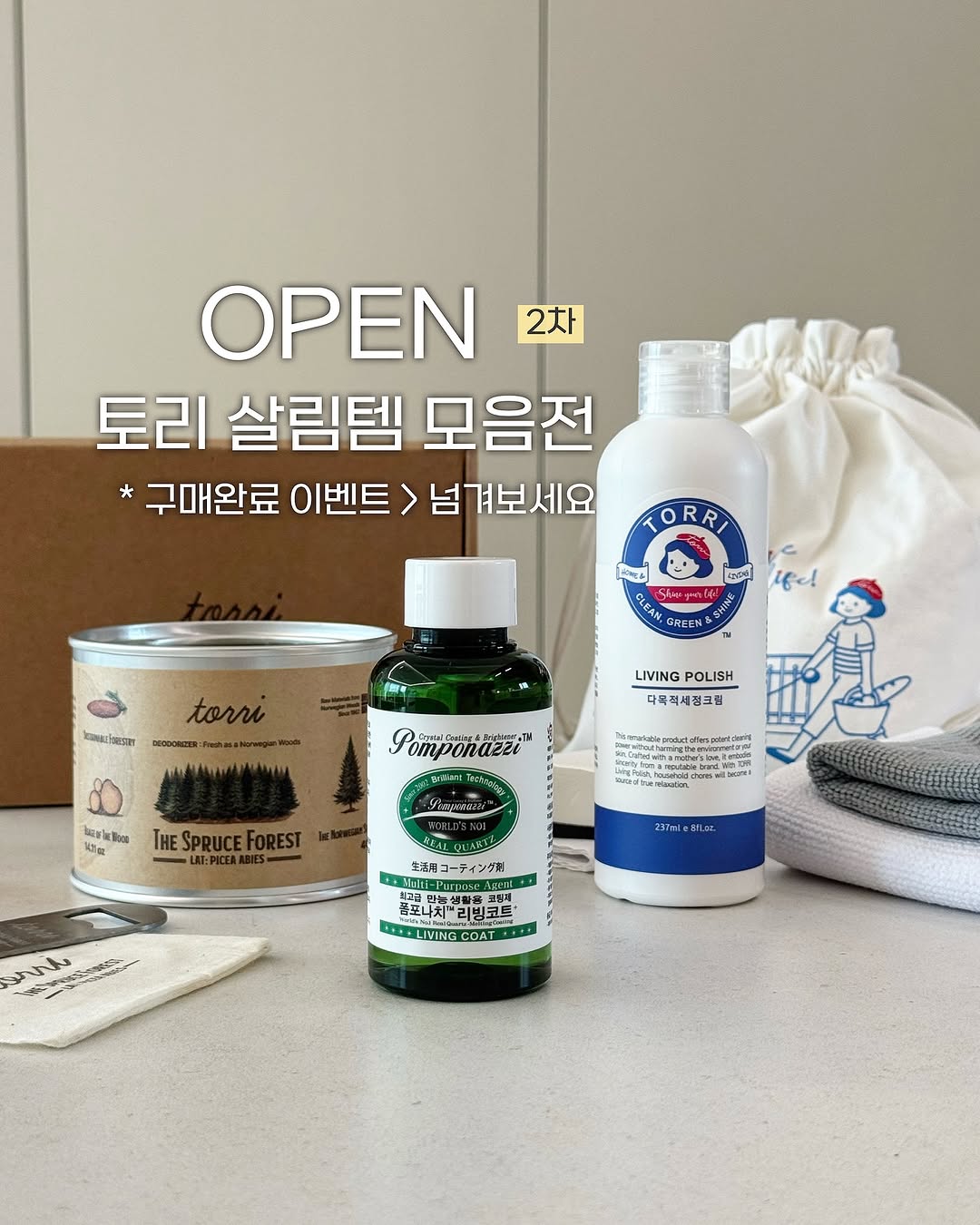 토리 모음전 2차 OPEN🎉 💟 구매완료 이벤트 💟 구매완료 댓글을 달아주시는 분들 중 추첨을 통해 리빙폴리쉬 / 리빙폴리쉬 / 노르웨이숲 탈취제를 보내드립니다 ✔️인당 제품 1개 / 9분 ( * 구매완료 최*희/8810) ______________________________ 지난 1차 일정때 많은분들이 사랑해 주셨던 토리 다목적세정제 ‘리빙폴리쉬 ’ 4개월만의 일정에 조금 더 다양하게 보여드리려고 ‘ 리빙코트 ’와‘ 탈취제 ’ 구성까지 포함해서 최저가로 가지고 왔어요 ☺️ 보통 연마제거제 성분이 들어있는 세정 크림들은 기존의 제품들을 스크래치를 내면서 묵은때를 제거해주는데 리빙폴리쉬는 그럴 걱정 없이 화장품 성분 약산성으로 순하고 나노기술력으로 손상없이 오염만을 쏙 제거하니 정말 편하실 거예요 ! 그리고 향기로 보통 덮는 탈취제가 아닌 숲처럼 공기 자체를 바뀌는 ‘ 좋은 탈취’ 공간속 냄새 입자를 효과적으로 흡착하여 숲의 숨결처럼 공기를 눈에 보이지 않게 정화해 자극적인 냄새가 아닌 숲에 온것 같은 기분이 드는 노르웨이숲 탈취제는 정말 무조건 추천드려요 🪴 또한, 폼포나치 리빙코트는 무기질 코팅제만 전문 생산한 브랜드로 제품력이 정말 좋은데 보통 시공 비용 50만원 하는 나노코팅을 집에서 쉽게 셀프로 할 수 있으니 정말 좋죠? ☝️ 석유화합물이 섞여 있지 않아 , 냄새가 없고 10년이 지나도 변질이 없어 소비기한 없이 사용 가능하다는것도 정말 큰 장점이예요 원목, 대리석, 세라믹, 포세린, 메탈, 아크릴, 유리 가죽까지 다양한 재질에 코팅이 가능하니 이제 한병으로 1년 내내 사용하시는거예요 🫶 지난번에 다목적 세정 크림 구매하신분들은 많이 남으셨지요 ? 선물용으로도 너무 좋고 탈취제와 리빙코트도 꼭 사용해보세요 💁🏻♀️ 🧺 토리 리빙폴리쉬 다목적세정크림 ▫️ 인공향료를 제거해 1차적인 자극 ❌ ▫️사용중 냄새나 가스 발생 ❌ ▫️100% FDA 승인을 받은 화장품 원료 ▫️PH 6.42의 세정제로 피부에 자극이 없어 맨손사용 가능 ▫️나노기술력으로 표면 손상없이 오염만 제거 ▫️시간이 지나도 딱딱하게 굳지 않음 ▫️발림성이좋아 소량 사용으로 충분히 오염제거 🪴 노르웨이숲 탈취제 ▫️공간 속 냄새 입자를 효과적으로 흡착 ▫️향균, 항산화 작용까지 갖춘 자연 유래성분 사용 ▫️포름알데히드, 암모니아, 아세트산, 아세트알데히드, 트리메틸아민 5대 생활 악취 집중 케어 ▫️국가 공인 시험 기관의 공식 성적서로 탈취력 입증 ▫️인공향 없이 기분좋은 편안함만 남기는 자연의 향기 ▫️인공색소를 사용하지 않은 자연그대로의 색감 ▫️100% 전성분 공개 , EWG그린등급 ▫️400g 대용량 고체겔로 더 오래 탈취 🚿 폼포나치 리빙코트 ▫️다양한 재질에 코팅이 가능한 세계적인 무기질코팅제 ▫️1병으로 34평 기준 1년 사용하는 용량 ▫️물때 ( 물얼룩 ) 편하게 제거 ▫️때가 덜 달라붙고 쉽게 제거되어 청소가 쉬워져요 ▫️나노코팅입자 코팅막 형성 ▫️90일간 지속되는 코팅력 넘겨보시면 활용법과 제품 소개 확인 하실 수 있으며 궁금한 내용 있으면 프로필 하단 고객센터 링크에 토리 / 폼포나치 리빙코트 있으니 문의 바로 넣어주세요 최대한 빠른 답변 도와드릴게요 ☺️ ___________________________ 📌 일정 : ~ 4/16 일주일간 진행 📌 구매 : @myunghee_homecook 제 프로필 하단 링크에서 구매가능 하세요 📌 구성 : - 토리 다목적 세정크림 공동구매 구성 :제품 파우치 + 본품 237ml + 촘촘한 극세사 리빙 타월 2장 - 노르웨이 숲 탈취제 : 노르웨이 숲 탈취제 1ea+ 사쉐 파우치 1ea + 오프너 1ea ( 옵션에 따라 최대 20% 할인 ) - 폼포나치 리빙코트 : 리빙코트 100ml + 리빙타올 2장 + 스웨이드천 4매 + 사각스펀지 1개 + 물때제거제 20ml ( 추가증정 : 스웨이드천 4매 + 사각 스펀지 1개 + 리빙타올2장 ) ____________________________ 💟 구매완료 이벤트 💟 구매완료 댓글을 달아주시는 분들 중 추첨을 통해 리빙폴리쉬 / 리빙폴리쉬 / 노르웨이숲 탈취제를 보내드립니다 ✔️인당 제품 1개 / 9분 ( * 구매완료 최*희/8810)