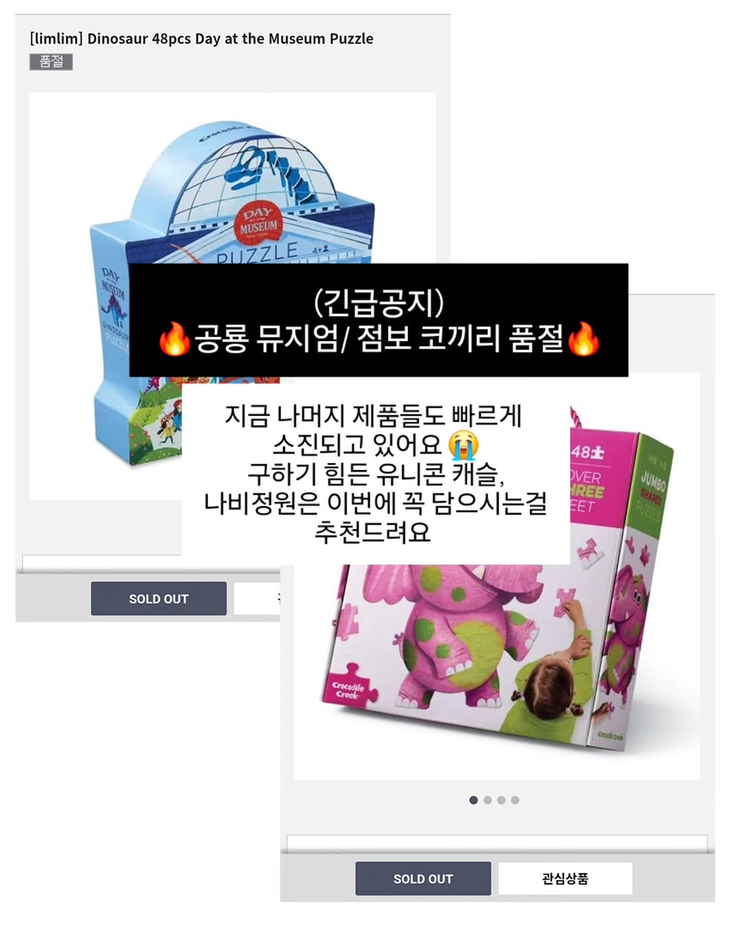다들 기다리셨던거예요?😭 나만 퍼즐 좋아하는거 아니었네.. 크로커다일크릭은 한번 빠지면 다른 퍼즐 못사요. 그때 그때 한국으로 들어오는 제품이 다르다보니 돈 있다고 살 수 있는 퍼즐이 아니라서 원하는게 있으시면 바로 담으셔야해요😭 언제 또 입고되는건지 알 수가 없음..😱😱 지금 코끼리퍼즐 추가물량도 모두 빠졌어요ㅠ 공룡퍼즐도 마감입니다. 본사 물량까지 모두 끌어왔던거라 더 없대요ㅠㅠ 힘들게 데려온 유니콘 캐슬, 나비정원은 놓치지 마시고 꼭 소장하시길 추천드려요🔥 🚨🚨유니콘 캐슬과 버터플라이 가든은 올해 재입고 예정이 없는 모델이라 림림월드 공구에서 마지막 모델이 될거같아요. ‼️내일 28일 토요일 퍼즐 마감입니다!!!! 최저가 링크는 ' 지금' 달아주시면 1초만에 dm드릴게요🔥🔥🔥 @limlimworld_ 프로필링크에서도 바로 보실 수 있어요.