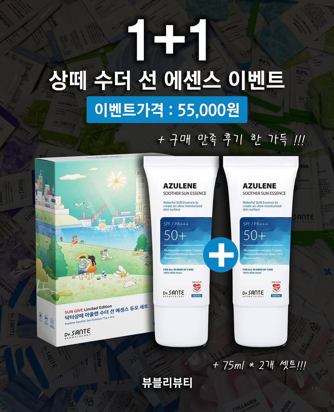 상떼 선크림 75ml 2개로 구성된 듀오셋트 1+1 이벤트입니다. 1년에 한 번 진행되는 특별한 기회입니다.