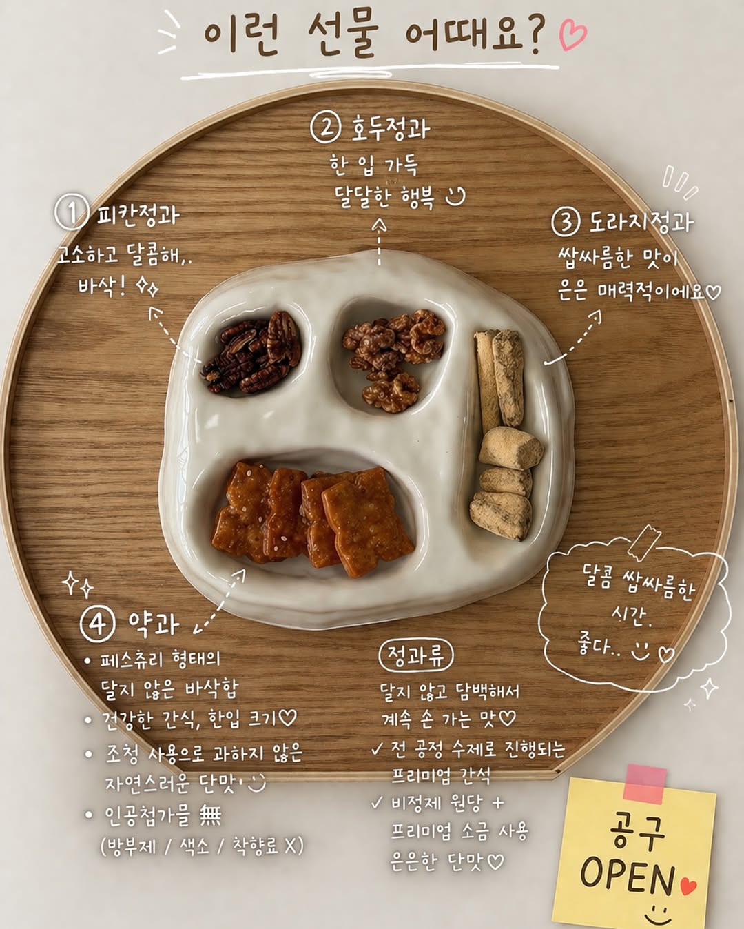 어버이날/스승의날 선물로 적합한 건강한 단맛의 약과와 정과 세트입니다. 가격은 1만원부터 시작하며, 맛과 품질이 뛰어난 제품입니다.