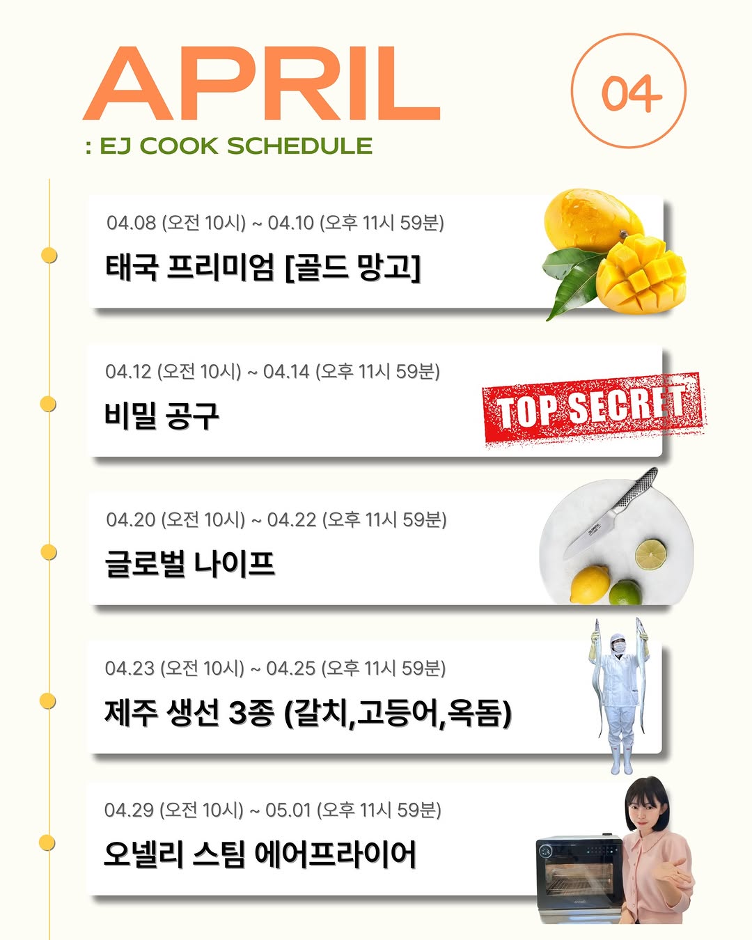 이제 정말 완연한 봄이 느껴지는 4월이에요 많은 문의를 주셨던 4월 일정 안내드려욤 :) 4월에는 오래 기다려주셨던 제품들부터 오직 이제이쿡에서만 만날 수 있는 Top secret 공구까지 알차게 준비했으니 정말 기대하셔도 좋습니다🙂 🥭 04.08 (수) - 04.10 (금) : 태국 골드망고 사실 제가 꾸준히 망고 공구를 해 오다가 2년정도 쉬었는데요 이번에 다시 꼭 소개드리고 싶은 망고가 생겨서 이유님들께 선물처럼 준비한 이벤트에요 정말 좋은 태국 프리미엄 골드망고를 가장 좋은 가격에 소개드릴께요 황금빛 색감에 당도까지 확실한 망고라 한입 드시면 바로 차이 느끼실 거예요 품질 관리부터 포장까지 꼼꼼하게 준비했으니 이번 이벤트도 놓치지마세요 :) 🤫 04.12 (일) - 04.14 (화) : Top Secret 공구 이제이쿡 공구는 도대체 어디까지인가?? 급이 다른 제품을 오직 이유님들께만 소개드릴께요 제가 작년부터 공들여 준비한 제품이에요 분명 이유님들께서도 좋아하실거고 다양한 이벤트와 함께 차근차근 소개드릴께요 무엇을 생각하든 그 이상이 될거에요🩷 🔪 04.20 (월) - 04.22 (수) : 글로벌 나이프 오래 기다리셨죠? 작년 7월 첫 공구 이후 드디어 9개월 만에 글로벌 나이프가 다시 돌아왔습니다 세계 3대 명품 칼로 꼽히는 최초의 일체형 스테인리스 나이프 칼날부터 손잡이까지 이음새가 없는 일체형이라 세균이 낄 틈이 전혀 없어요 기다려주신 만큼 우주최저가와 최대혜택으로 네이버 라이브방송까지 준비되어있으니 많이 기대해주세요🥰 🐟 04.23 (목) - 04.25 (토) : 제주생선 3종 세트 2년의 기다림 끝에 선보인 제주생선 3종! 오픈하자마자 품절 대란을 일으켰던 제주생선3종을 감사한 마음으로 다시 한번 준비했습니다 제주 해안에서 어획하자마자 급냉해 신선함을 그대로 유지한 제주 갈치,핑크 옥돔, 제주고등어 다가오는 가정의 달을 앞두고 부담 없이 준비하시기 좋은 구성으로 보여드릴게요🩷 🫧 04.29 (수) - 05.01 (금) : 오넬리 듀얼 스팀에어프라이어 카톡 채널이랑 DM으로 문의가 끊이지 않았던 바로 그 제품 첫 소개 때 2분도 안 되어 품절을 기록했던 오넬리가 드디어 돌아왔어요 오넬리는 강력한 115℃ 직분사 스팀으로 한 번 촉촉한 100℃ 증기 스팀으로 또 한 번 조리하는 듀얼 스팀 방식이에요 겉은 바삭하고 속은 촉촉하게 잡아주는 것은 물론 기름때를 불려주는 스팀 세척 기능 덕분에 관리까지 정말 간편해요. 오븐, 에어프라이어, 스팀기 사이에서 고민하셨다면 이제 오넬리 하나로 끝내셔도 좋습니다 그동안 기다려주신 만큼 만족스러운 혜택으로 보여드릴게요. 😊 포근한 봄바람과 함께 기대되는 4월이에요 정말 좋은 제품들로 알차게 준비했으니 놓치지 말고 함께해주세요🙂 #이제이쿡4월일정