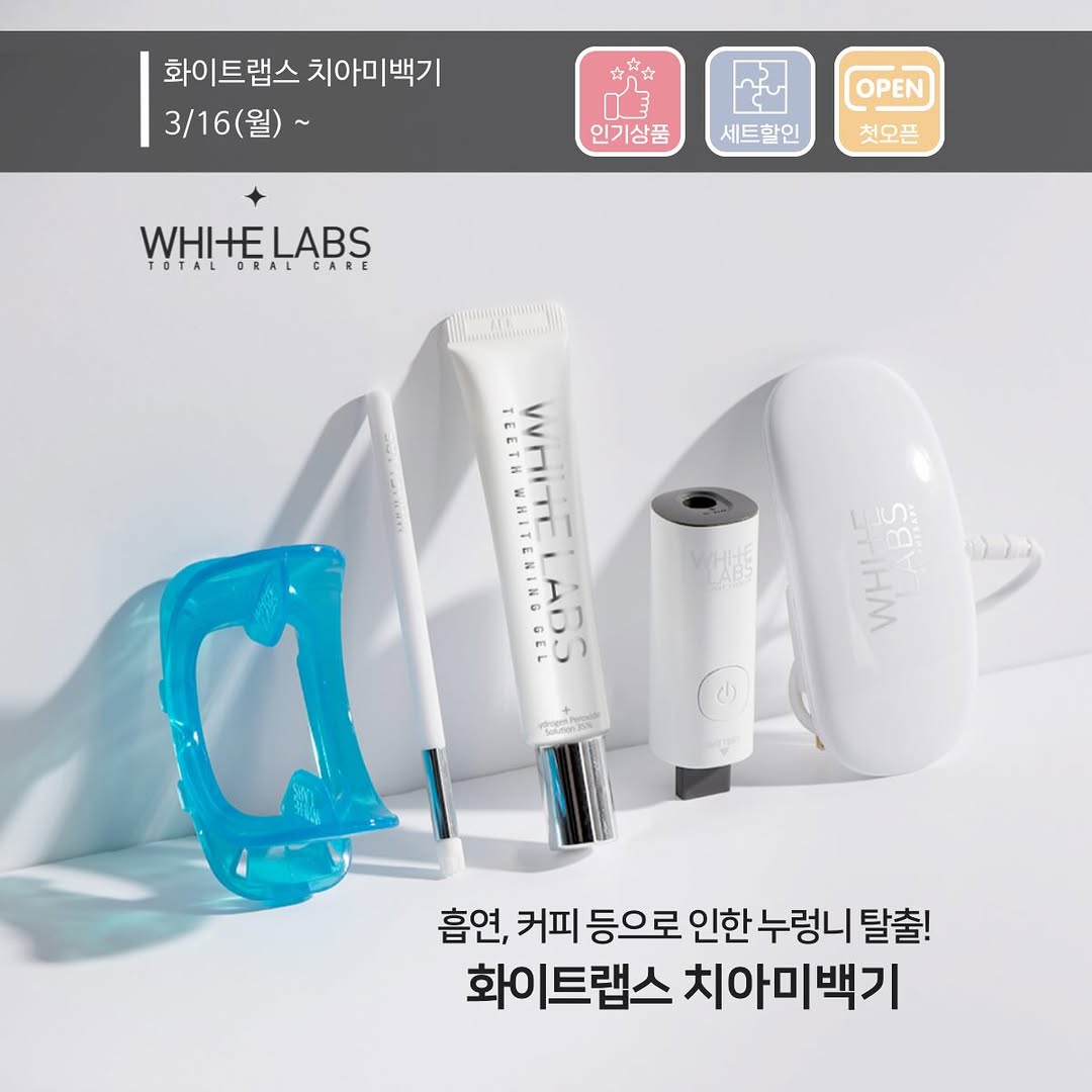 화이트랩스 치아미백기 공동구매 오픈! 본품과 젤 증정, 최저가로 제공됩니다. 1년 넘게 사용한 제품으로, 치아 미백에 효과적입니다. 첫 입문자와 기존 사용자 모두를 위한 세트 구성도 있습니다.