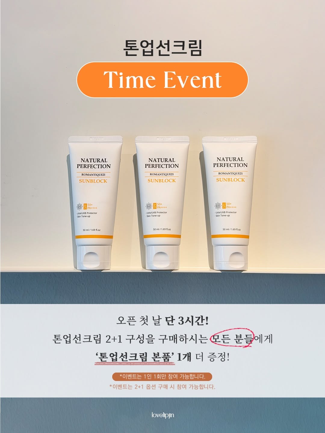 톤업선크림 2+1 구성 구매 시 본품 1개 추가 증정. 총 4개를 받을 수 있는 한정 타임딜 이벤트로, 3시간 동안 진행됩니다.