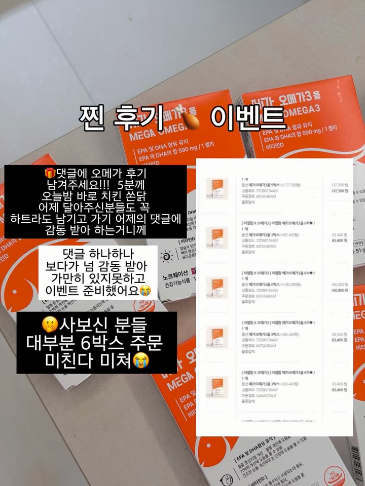 오늘 밤 스토리 공지후 바로 치킨 쏜닭🍗🍗 이번에는 6박스 9박스 12박스 주문이 엄청네요!! 어제 후기 댓글 읽다가 감동한 극 에프😭 ㅋㅋㅋ 가격이면 가격, 맛이면 맛, 함량이면 함량 다 갖춘 오메가 3는 뭐다? 메가오메가유 🌸 오늘 하루 기분 좋은 하루 보내기 !!!!!!!!