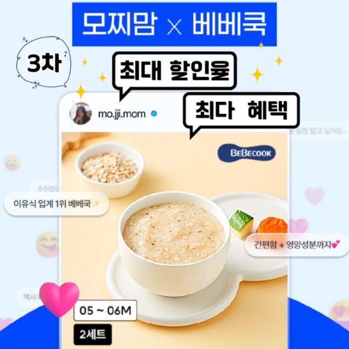#3차공구오픈 🗓3월 26일 오전 10시 OPEN🗓 💙이유식 부문 1위 브랜드💙 💙베베쿡 냉장이유식💙 🚨링크 필요하신분들은 댓글에 '링크'적어주세요🚨 🚨오픈시, 자동화 DM으로 구매 링크 전송됩니다🚨 - 여러분..! 베베쿡 2차때 구매하신 베베쿡 이유식 잘 챙겨주고 계신가요~? 슬슬 떨어질때쯤... 베베쿡 이유식 3차 공구 OPEN 합니다❤️ - 🎖이유식 업계 1위 베베쿡🎖 기다리신 분들 너무 많으셨을 것 같아요..☺️ 저도 베베쿡 애용중이라서 이번에도 왕창 쟁여야겠습니다ㅋㅋㅋ - 저처럼 요알못이신분들은...?🤔 이유식 만들시간 턱없이 부족하신 분들🥺 베베쿡 이용해보시라고 말씀드리고 싶어요!! 괜히 업계 1위가 아니고요. 맛부터 배송까지 아~주 만족스럽게 이용하고 있어요.👍 - 그리고, 베베쿡 이유식이 특별한 이유가 ✨️전문가 영양 맞춤 설계로✨️ 체계적인 식단 관리가 가능해요. 🔥맛+영양+위생+배송까지 완벽한🔥 🍚베베쿡🍚 (제가 이유식부터 키즈식까지 먹이고 있는 이유) - ✅️이유식 만들기 힘드신 분들 ✅️매일 반찬 걱정 하시는 분들 ✅️맛과 영양 걱정되시는 분들 🥣베베쿡🥣 하세요! - 📍특징📍 ✅️1등 이유식의 노하우를 담은 1,000여개의 영양레시피 ✅️서울대학교 식품영양학과외의 MOU를 통한 전문성 강화 ✅️아기 월령과 성장발달에 따라 이유식&영양식을 15단계로 세분화한 맞춤 식단 제공 ✅️당일 생산&당일 배송 원칙 ✅️업계 최초 제조 시간 표시 도입 ✅️HACCP 인증 완료 ✅️국내산 1등급 한우/닭/돼지 사용 ✅️다양하고 신선한 채소 사용 ✅️유기농 국내산 쌀 사용 등등 배송까지 완벽해서 완전 애용중...!❤️ - 📍라인업 및 추천연령📍 ✅️초기 2 - 이유식 150g 👉 (5~6개월) ✅️중기 1 - 이유식 160g 👉 (6~7개월) ✅️중기 2 - 이유식 160g 👉 (7~9개월) ✅️후기 1 - 이유식 180g 👉 (9~10개월) ✅️후기 2 - 이유식 180g 👉 (10~11개월) ✅️후기 3 - 이유식 180g 👉 (11~12개월) ✅️완료기 - 이유식 180g 👉 (12~14개월) ✅️한우소보로 - 한우토핑 100g 👉 (12개월 이상) ✅️순한우소보로 - 한우토핑 100g 👉 (9개월 이상) ✅️트러플한우페이스트 - 한우토핑 120g 👉 (6개월 이상) ✅️영양반찬 - pre 키즈식 55~120g 👉 (키즈식 전, 완료기 이후 추천) ✅️볶음밥&키즈국 - 키즈식 130~140g 👉 (일반식은 아직 이른 아이 추천) ✅️울특찬 - 키즈식 130~180g 👉(일반식은 아직 이른 아이 추천) - 공구 링크에서 바로 이유식 구매하는 방식이 아닌, 베베쿡 사이트에서 이용 가능한 ⭐️상품권⭐️ 구매하는 방식이에요! 구매하신 상품권을 베베쿡 공식홈페이지에서 등록하신 후 이유식을 주문하는 방식입니다. ⚠️ID당 한 품목당 최대 3개 구매 가능⚠️ - ✅️3월 27일 오전 9시까지 주문건까지➡️3월 27일 10시부터 순차 발송 ✅️3월 30일 오전 9시까지 주문건까지➡️3월 30일 10시부터 순차 발송 (*주문폭주시 1-2일 지연 가능성있습니다만, 최대한 맞춰 보내드릴 예정입니다) 상품권은 🚨카카오톡🚨으로 전달되며, 안심번호 설정 시 오류가 생길 수 있으니 꼭 실제번호로 기재해주세요! 상품권 수신/등록 그외 궁금하신 점은 '큐닷 CS'로 문의주세요. CS링크는 제 프로필링크 통해 확인 가능합니다. - 📍상품권 등록 유효기간📍 ✅️26년 4월 30일까지⭐️ ✅️상품권 등록 이후에 배송 일자 설정은 최대 300일까지 등록을 4월 30일까지 해주시면 됩니다 ! ! 4월 30일날 등록하셨으면, 등록한 날부터 배송 지정 날짜를 최대 300일까지 설정 가능.😉 - 📍상품권 이용방법📍 피드사진 참고👀 ⭐️구매하실때 TIP⭐️ 초기 이유식하시는 분들도 중기&후기&완료기 등등 미리 구매해놓으셔도 OK - 📌공구 일정📌 3월 26일 오전 10시~29일 자정 마감 - 📌구매링크📌 프로필링크 참고 - 📌구매 감사 이벤트📌 1. 이유식 16세트 구매 시 🎁베베쿡 롱뻥 1단계 4ea 선물 증정🎁 2. 키즈식 8+8세트 구매 시 🎁베베쿡 젤리 선물 증정🎁 *별도 출고, 중복 제공X - 📌구매 인증 이벤트📌 '구매완료/핸드폰뒷자리' 남겨주세요! 총 N분께 🎁네이버페이 5000포인트🎁 선물보내드릴게요.