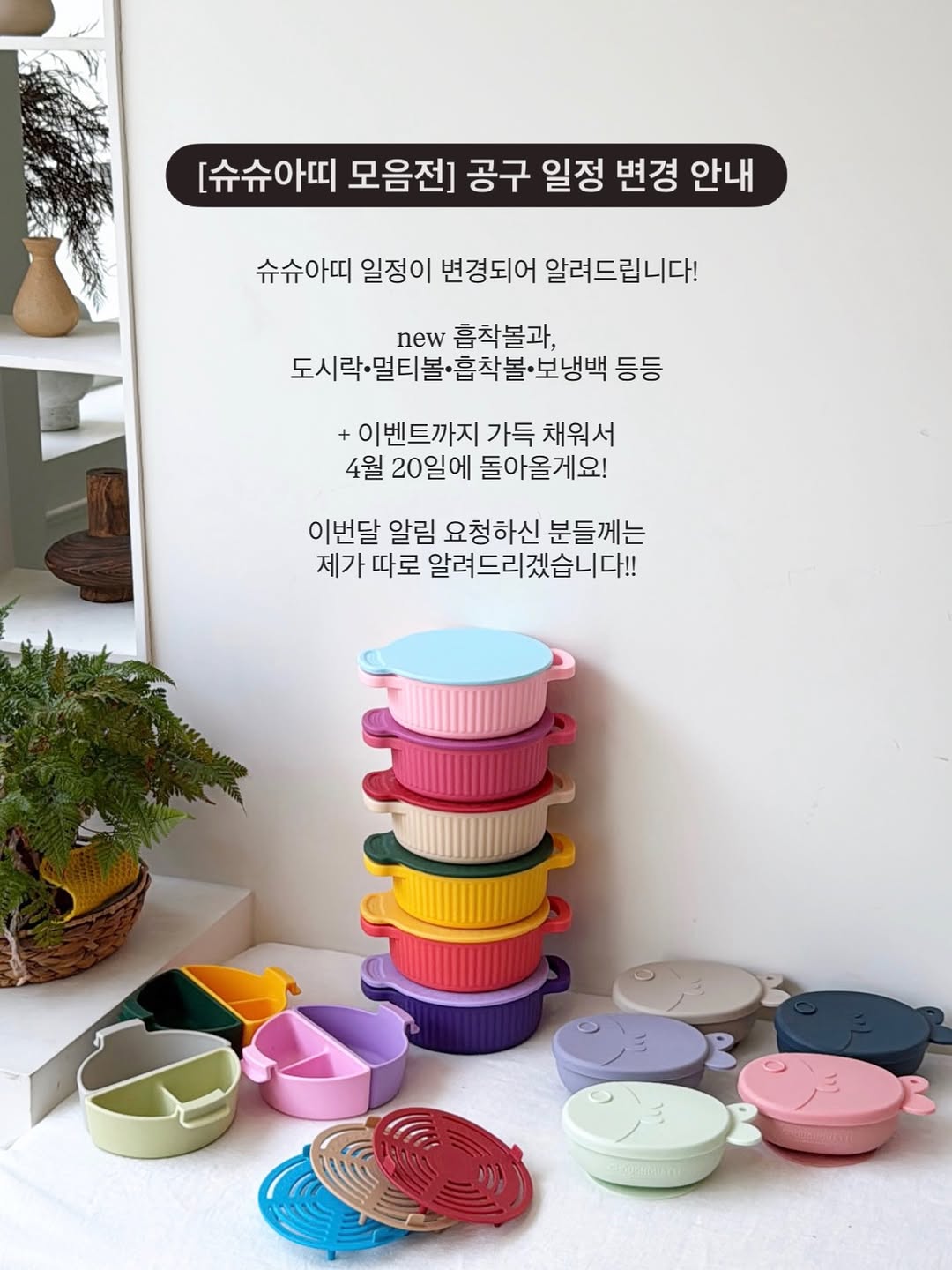 [슈슈아띠 모음전] 공구 일정 변경 안내 안녕하세요! 애플랜입니다☺️ 슈슈아띠 공구 일정이 변경되어서 알려드려요..! 흡착볼 new 색상 출시 및 도시락•멀티볼(찜기)•보냉백 등의 재고 수량 확보를 위해 내린 결정이라, 슈슈아띠 기다려주신 모든 분들께 양해 부탁드리는 바입니다😭♥️ 정말 많이 기다려주셨을텐데🥹 저도 살짝 아쉽지만, 더 큰 혜택을 드리기 위한 과정이니 이해해 주셨으면 좋겠어요..!♡ + 이벤트까지 가득 채워서 4월 20일에 돌아올게요! 이번달 알림 요청하신 분들께는 제가 따로 알려드릴게요~!! (다음달 공구 오픈시에도 알림 드리겠습니다♥) 감사합니다♥ 🗓️슈슈아띠 일정 ✦ 기존 : 3/30 ~ 4/1 ✦ 변경 : 4/20 ~ 4/23 📍공구 구성 ✦ 도시락(+내컵) ✦ 멀티볼(+찜기, 디바이더) ✦ 흡착볼 ✦ 미니 보냉백(+미니포크/아이스팩) ✦ 도시락 보냉백 #슈슈아띠 #아기도시락 #소풍도시락 #이유식준비물 #어린이집소풍