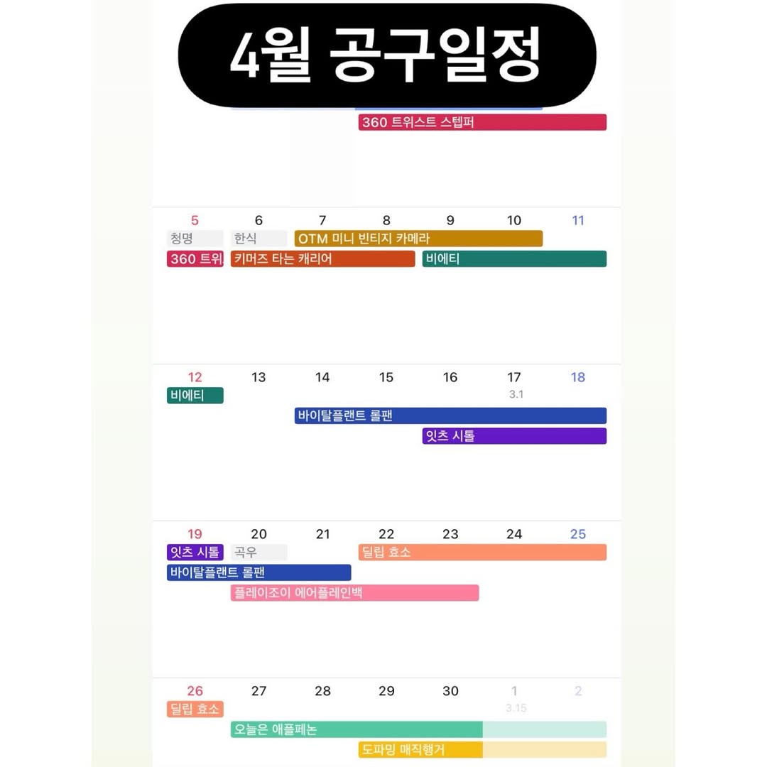 ▶️ 2026년 4월 공구 일정 ◀️ 📍피타니 먹는 레티놀 공구중 1-5 360 트위스트 스텝퍼 6-8 키머즈 타는 캐리어 7-10 미니 카메라 9-12 비에티 14-21 롤팬 16-19 잇츠 시톨 20-23 플레이조이 에어플레인백 (🆕) 22-26 딜립 효소 27-5/3 오늘은 애플페논 28-5/1 디알고 헤드셋 29-5/3 도파밍 매직행거 본격적인 봄 나들이 시즌인 4월에도 익숙한 것과 새로운 것들이 공존합니다. 🔻다시 만나는 공구들🔻 - 임산부/수유부도 섭취가능한 부기차 ‘비에티’ - 후기 너무 좋은 ‘바이탈플랜트 롤팬’ - 다낭성/생리불순/임신 준비엔 ‘잇츠 시톨’ - 소화가 잘 안된다면 ‘딜립 효소’ - 탄산 대신 체지방 감소 효과 ‘오늘은 애플페논’ - 여행시, 외출시 필수 ‘디알고 헤드셋’ - 다음 진행 문의 많았던 ‘도파밍 매직행거’ 🔻처음 만나는 공구🔻 - 스텝퍼 최강자 ‘360 트위스트 스텝퍼’ - 예쁜데 기능도 좋은 타는 캐리어 ‘키머즈’ - 미니 빈티지 카메라 다양하게 써보고 고른 ‘OTM’ - 비행기에서, 기차에서 최고 ’플레이조이 에어플레인백‘ 3월 공구 기대 댓글 당첨자 분들은 @namhee.h @na_on_200703 @lovely_151205 @_miriii29 @yellowoo_ 5월에는 어떤 공구가 기대되실까요? 그리고 어떤 공구를 진행했으면 하실까요? 댓글을 남겨주신 분들 중 다섯 분을 추첨하여 스타벅스 기프티콘을 보내드립니다. 그리고 공구가 시작되면 대댓글로 알려드립니다. 댓글은 다음 공구 일정이 올라오기 전까지 달아주시면 자동으로 이벤트 참여가 됩니다. 주기적이지 않은 품목/진행요청 온 것들 중에서 5월에 진행 예정인거 몇 가지 말씀드리자면 - 건강한 과자 ’병아리콩칩&통밀칩‘ - 따뜻해지면 찾아오는 모기 대비 ‘힐조밤’ - 오랜만에 돌아오는 ’레미레미 땅콩버터‘ - 원래부터 잘 쓰고 있던 ’퓨리톡스 세정티슈‘ 항상 믿고 구매해주셔서 감사합니다🫶🏻 #베라킴공구#댓글이벤트#4월공구일정 #베라킴_이벤트#베라킴이벤트