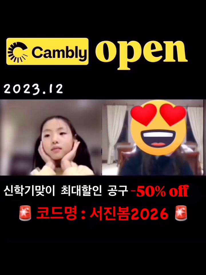 캠블리에서 신학기 맞이 최대 50% 할인코드를 제공하는 화상영어 체험 수업입니다. 3/23부터 27일까지 신청 가능하며, 댓글로 요청하면 할인코드와 체험 방법을 안내합니다.