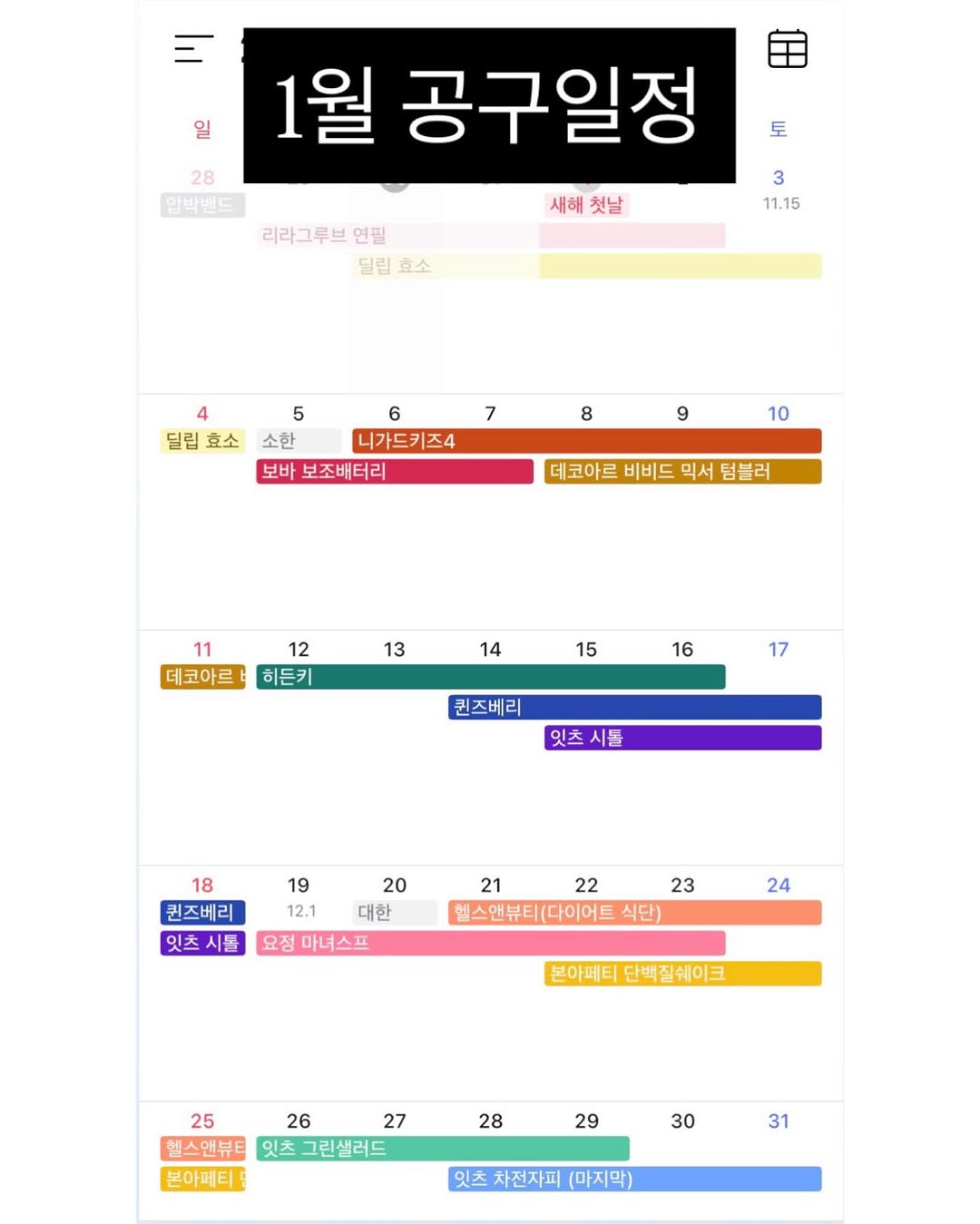▶️ 2026년 1월 공구 일정 ◀️ -2 리라 그루브 새학기 모음전 -4 딜립 효소 3종 5-7 보바 보조배터리 6-10 니가드키즈4 (카시트 발판) 8-11 데코아르 비비드 믹서 텀블러 12-16 히든키 14-18 퀸즈베리 15-18 잇츠 시톨 19-23 요정 마녀스프 (+신제품 🆕) 21-25 헬스앤뷰티 (다이어트 식단 골라담기) 22-25 본아페티 단백질쉐이크 26-29 잇츠 그린샐러드 28-31 잇츠 차전자피 (마지막 진행⭐️) 2025년이 가고 어느덧 2026년의 첫 공구일정을 공유하는 그런 날이 왔네요. 기분이 요상해.. 1월에도 익숙한 것과 새로운 것들이 공존합니다. 🔻다시 만나는 공구들🔻 - 맛있는 효소 3종 ‘딜립 효소’ - 주니어 카시트엔 필수 ‘니가드키즈4’ - 가성비 갑쓰 ‘데코아르 비비드 믹서 텀블러’ - 베스트셀러 키성장 영양제 ‘히든키’ - 여자한테 참 좋은 ‘잇츠 시톨’ - 만들기 번거로운 마녀스프를 쉽게 ‘요정 마녀스프’ - 다이어트 식단을 맛있게 ‘헬스앤뷰티’ - 맛있는 단백질 쉐이크 ‘본아페티’ - 밥 먹기 전 채소 한 포 ‘잇츠 그린샐러드’ - ⭐️마지막⭐️진행 ‘잇츠 차전자피’ 🔻처음 만나는 공구들🔻 - 새학기를 위한 ‘리라그루브 연필’ - 여행유튜버 빠니보틀 픽 ‘보바 보조배터리’ - 손쉽게 먹는 블루베리 ‘퀸즈베리’ 12월 공구 기대 댓글 당첨자 분들은 @moyamoyam0_00 love_jjanggu @sol_94_kim @anyoung0919 @yjk_9489 1월에는 어떤 공구가 기대되실까요? 그리고 어떤 공구를 진행했으면 하실까요? 댓글을 남겨주신 분들 중 다섯 분을 추첨하여 스타벅스 기프티콘을 보내드립니다. 그리고 공구가 시작되면 대댓글로 알려드립니다. 댓글은 다음 공구 일정이 올라오기 전까지 달아주시면 자동으로 이벤트 참여가 됩니다. 주기적이지 않은 품목/진행요청 온 것들 중에서 2월에 진행 예정인거 몇 가지 말씀드리자면 - 가벼운 명절 선물로 좋은 F5커피 - 지난 추석에 진행 안해서 서운해하신 ‘온정심 굴비’ - 그동안 재진행문의 정말 많이 받은 ‘롤팬’ 항상 믿고 구매해주셔서 감사합니다🫶🏻 #베라킴공구#댓글이벤트#1월공구일정