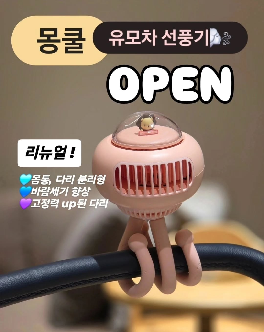 #공구오픈 #몽쿨유모차선풍기 ⭐️공구 특별할인 예정⭐️ 지인과 함께 1+1‼️하면 좀 더 저렴해집니다🔥 ------------ 올여름도 일찍오고 길게 머문다네요 상상만해도 벌써 숨이 턱 막혀요 ,,🥵 체온이 높은 우리 아이들은 또 얼마나 힘들까요 ... 다가오는 여름, 이건 꼭 필요해요🌬 네이버 1위, 고객만족도 4.9, 누적판매량 20만개, 16,000개의 후기가 증명하는 몽쿨🔥 아이선풍기 최초 안심보험😍 발열가능성 ❌️제로❌️ 위험 날개없는 선풍기 세이프윙 탑재 머리카락, 손가락 끼임 사고없어 안심🩷 ---------------- 🏷공구일정 4/22 - 25 ---------------- ⭐️국내 유일 0세부터 사용가능⭐️ 전자파안심‼️ 유모차 선풍기 몽쿨🍃 체온조절 능력이 미숙해 땀을 많이 흘리는 우리 아가들 여름 외출 필수템🔥 tip ) 이유식 먹이시는 엄마들, 입으로 후후 불어주면 안되는거 다들 당연히 알고 계시겠죠 ? 충치균은 어른에게서 옮는다는 거😭 몽쿨로 식혀서 주어도 good😍👍 ✅️전자파❌️ 유일한 유모차 선풍기 ! ✅️위험 날개없는 선풍기 세이프윙 탑재 ✅️선풍기(몸통)와 문어발 분리 ✅️아이선풍기 최초 안심보험 ✅️고강도스틸로 더 튼튼해진 다리 ✅️고속충전 가능한 대용량 배터리 ✅️150도 자동회전 ✅️수면풍모드 가능 ✅️동판모터로 열오름현상 제로 ✅️간편한 C타입 충전 1단계 : 약 16시간 2단계 : 약 9시간 3단계 : 약 4시간 4단계 자연풍 바람 : 약9시간 유모차, 자전거, 킥보드, 침대, 자동차 어디든 간단하게 사용가능🌬 더운 여름의 시작 전, 우리아이를 위해 망설이지말고 저렴하게 시원한바람 장만해주세요🧊 유모차에 꽉 조여주시면 움직임없이 사용가능하십니다😍🫶