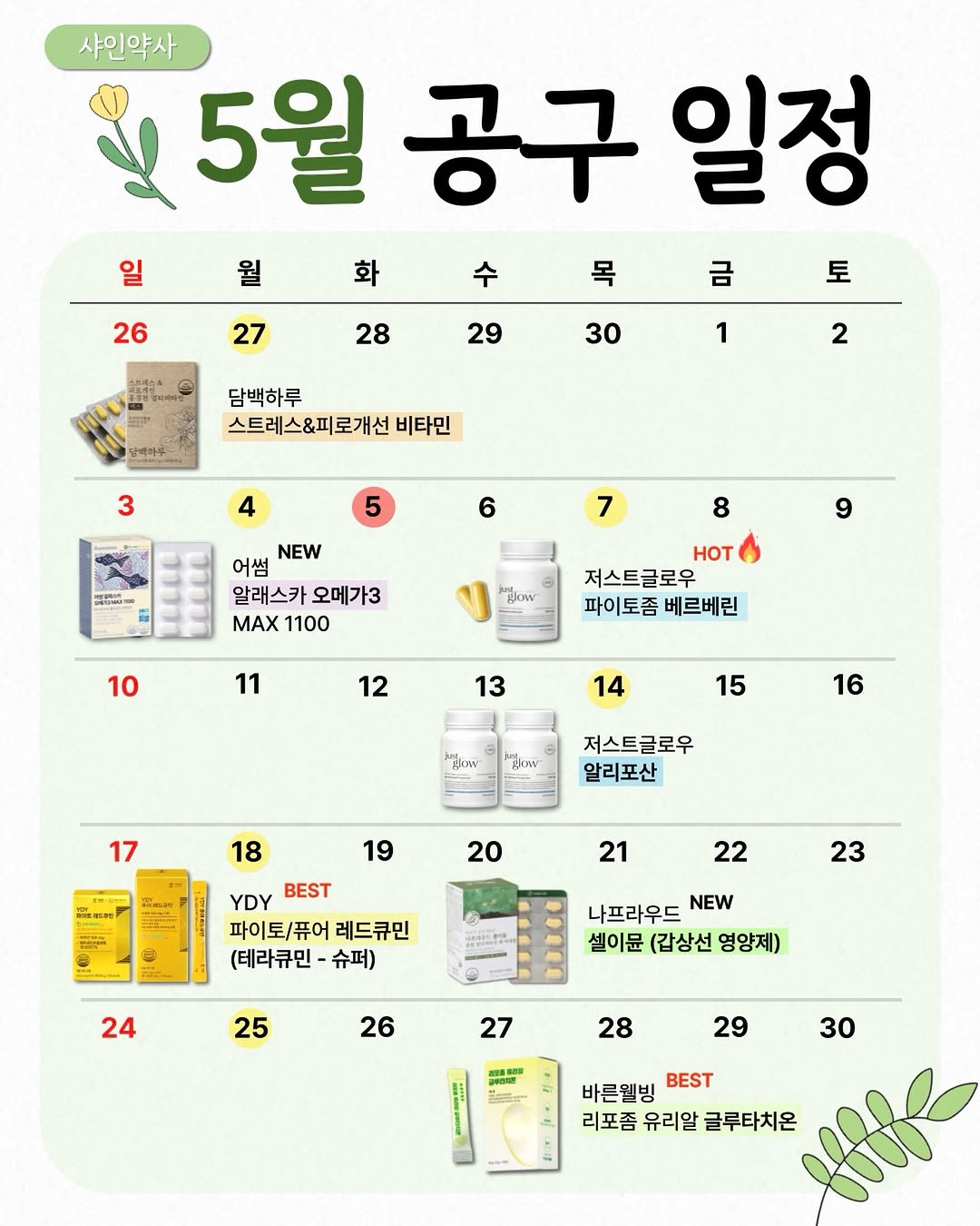 5월 공구 일정! 어떤 것이 가장 기다려지실까요?☺️❤️ ▪️5월 4일 (월) < 어썸 - 알래스카 오메가3 MAX 1100 > EPA+DHA 합 1100mg 최고 함량 80% 최고 순도 비린내 없이, 향긋한 레몬향🍋 ▪️5월 7일 (목) < 저스트글로우 - 파이토좀 베르베린 > 혈당, 체지방, 콜레스테롤 감소 이탈리아 indena사 berbevis 원료 흡수율 높고 위장 부담 적은 타입 1알에 베르베린 550mg → 식후 혈당, 뱃살 고민 있는 분들 꼭⭐️ ▪️5월 14일 (목) < 저스트글로우 - 알리포산 > 활성형 (R형) 알파리포산 = 알리포산 혈당, 체지방, 노화, 피부 미백 한번에! 당뇨 합병증 예방, 비만약 처방 핵심 성분 ▪️5월 18일 (월) < YDY - 파이토/퓨어 레드큐민 > ⭐️ 테라큐민-슈퍼 원료 흡수율 85.2배 증가 고함량, 고흡수 커큐민 → 만성염증, 통증, 피부 트러블 관리 핵심! ▪️5월 21일 (목) < 나프라우드 - 셀이뮨 (갑상선 영양제) > 갑상선 저하, 항진, 하시모토 등 갑상선 기능에 필요한 비타민 미네랄 구성 → 피로, 붓기, 대사량 변화에 고민 있는 분들 ▪️5월 28일 (목) < 바른웰빙 - 리포좀 유리알 글루타치온 > 순도 90% / 순수 글루타치온 500mg 리포좀 형태로 흡수율 UP 피부 미백 + 간 해.독 동시 케어 5월에는 많이 기다려주시는 제품과 새로 소개드리는 제품까지 다양하게 준비했어요! 공구 알림 필요하시면 필요한 제품 댓글 남겨주시면 오픈하고 알림 보내드릴게요 ❤️