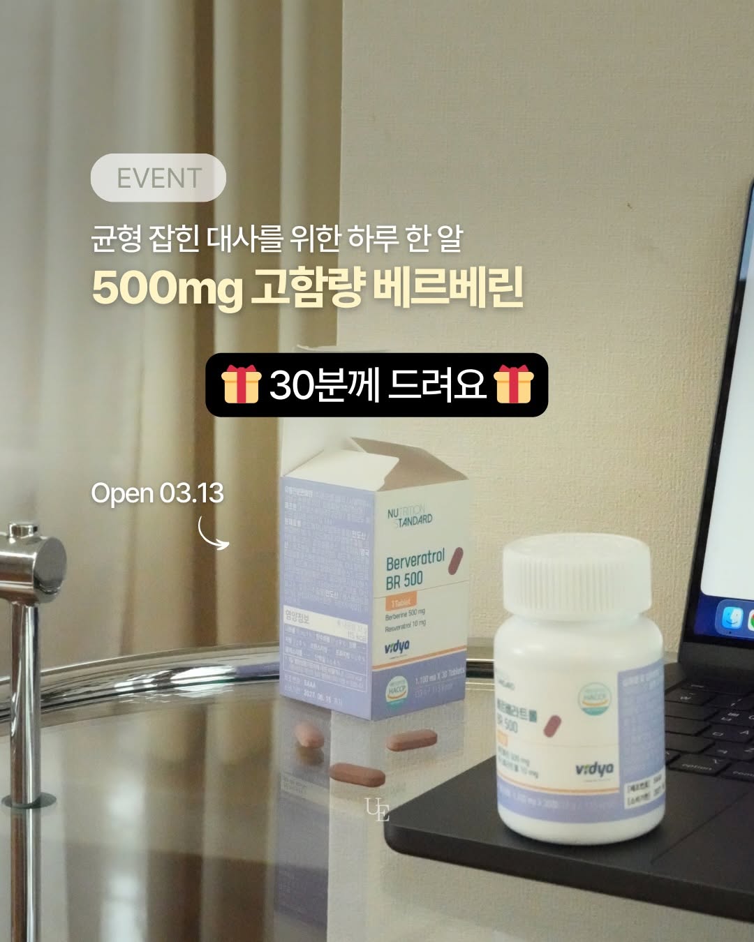 (이벤트) ‘베르베린’ 오픈 소식 전합니다 아무 이모티콘 남겨주세요💜💜💜 ⭐️500mg 고함량 베르베린 최다 구성 기준 1개월 1만원대⭐️ 업체의 이득보다 많은 분들께 좋은 제품을 합리적인 수준의 가격으로 드린다는 각오로 만드셨다고합니다!! 🔻주원료와 함량 하루 1알로 👇 1️⃣ 베르베린 500mg (매자나무열매 성분 555mg) VIDYA사 90% 이상 고순도 원료 2️⃣ 레스베라트롤 10mg 👉 베르베린은 혈당 조절과 항산화 작용으로 잘 알려진 식물 유래 성분이에요 👉 여기에 레스베라트롤을 더한 시너지 조합! 둘이 만나면? AMPK 라는 우리 몸 에너지 센서가 활성화됩니다! 특히 베르베린에 레스베라트롤을 더한 조합은 국내에서 쉽게 구하기 어렵답니다 🔻섭취방법 1일 1회 1알씩 공복 섭취 권장 (위장장애 있으시면 식후 섭취!) 고등학생부터 섭취 가능 권장 휴지기 없음, 꾸준한 관리 OK 🔻가격 & 일정 ▪️2박스 (60정) 2개월분 80000원 → 55,000원 (31% 할인) (1병당 27500원) ▪️4박스 (120정) 4개월분 160000원 → 98,000원 (39% 할인) (1병당 24500원) ▪️8박스 (240정) 8개월분 320000원 → 169,500원 (47% 할인) (1병당 211880원) ▪️12박스 (360정) 12개월분 480000원 → 227,000원 (53% 할인) (1병당 18917원) 🔻공구 기간 3월 13일 오전 10시부터 일주일 (조기 품절될 수 있어요 🙏) 🔻소비기한 2027년 8월 31일까지로 넉넉! 🔻명절 연휴 기간 할인된 가격으로 구매해두시고, 배송은 연휴 끝나고 순차 배송 시작됩니다🤍 🔻섭취 시 주의사항 1️⃣ 위장트러블(소화불량, 복통) 있으면 → 식후 1알 드세요 2️⃣ 면역억제제 복용 중이면 섭취 금지 3️⃣ 간·신장 수치가 좋지 않다면 섭취 X 4️⃣ 임산부·수유부는 권장하지 않아요 5️⃣ 유산균과는 2시간 이상 간격 두세요! 🔻드시고 혹시나 부작용이 있을까 망설여진다면? 미개봉 제품 환불 도와드리겠습니다! (거의 없으실 겁니다 그만큼 자신 있어요!) 🔻색이 왜 보라색인가요? 안은 노란색이에요~ 장에서 잘 녹도록 코팅이 되었습니다 :) ✔️마지막으로 베르베린은 ‘약’이 아닙니다 혈당과 항산화를 꾸준히 관리하는 ‘식물성 성분’ 이에요 약처럼 일회성으로 기대하기보다, 생활습관과 함께 지속적으로 건강관리 해주세요! 필요하신 분들께 좋은 기회 되시길 바랍니다 궁금하신 점은 언제든지 댓글이나 DM 주세요!❤️ [알림] 💜💜💜 혹은 아무 이모티콘 남겨주시면 오픈시 좋아요 눌러 알림 드리고, 알림 + 구매완료 하신 분들 랜덤 30분께 본품 선물 드리겠습니다!