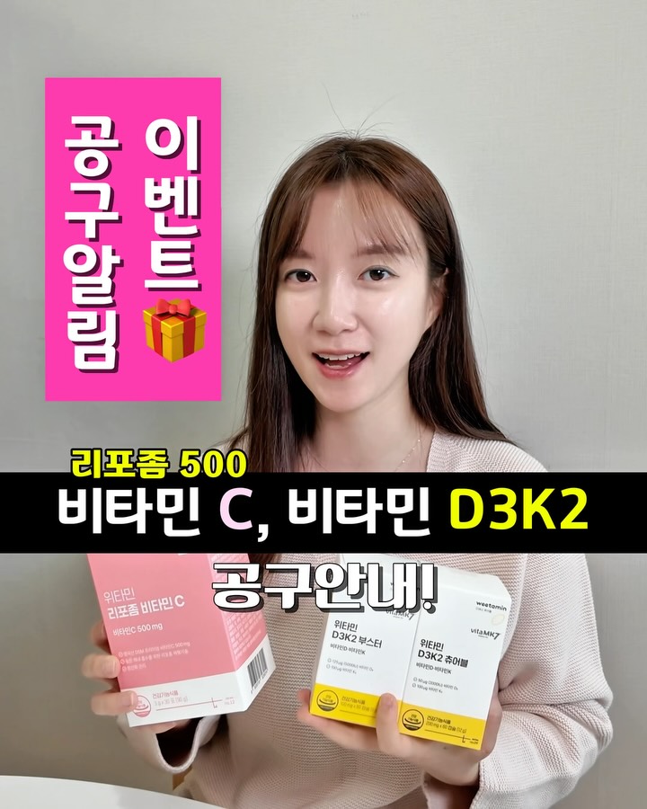 기본중의 기본, 비타민C와 비타민D 공구알람입니다🎁 : 3/23 오픈해요! 알람주신 분들 10분께 제품 보내드려요:) (랜덤) 1️⃣ 흡수율을 높여 더 효율적으로, 오래가는 리포좀 C 500 2️⃣ 뼈에 더 도움되는 K2가 함께 들은 D3K2 에요 업그레이드가 필요없는 제대로 된 기본템✔️ 🙌소개드리는 이유 알려드릴게요 1️⃣ 리포좀 비타민 C 500 일반 비타민C도 훌륭하지만, 4-6시간 마다 자주먹어야 하는 단점, 산 성분이라 위장약한 아이들이나, 어른들도 부담이 있죠 메가도즈 하기에도, 온가족이 편하게 먹기도 괜찮습니다 -리포좀 기술 적용해서 더 높은 흡수율로 오래 지속 -특허 리포좀 기술 보유한 리포좀 -한포 500mg 함량으로 아이부터 청소년, 어른까지 함께 섭취 -짝꿍 포도맛으로 너무 시지않고 맛있습니다 소비기한: 27.04.20 2️⃣ 위타민 D3K2 츄어블 2000iu, 부스터 5000iu 누구나 먹어야 하는 [비타민D] 더 특별한 K2가 포함된 [비타민D3+K2]에요 비타민 D의 역할이 다양하지만, 꼭 필요한 역할중 하나가 뼈성장이죠. 칼슘이 장에서 흡수되어 뼈로 전달되려면 K2가 꼭 한데요, 잉여의 칼슘이 이곳저곳으로 떠돌지 않고 제자리를 찾게 막아주는 역할이기도 합니다. ✔️그렇기에, 뼈성장이 필요한 아이들이나 청소년 ✔️어르신 들은 이 조합을 무조건 추천드립니다 안 먹을 이유가 없죠! 👉위타민 D3K2 츄어블 2000iu : 제주산 제주감귤 과즙분말로 맛을 낸 ”감귤맛 츄어블 D3K2“ 아이들이 진짜 좋아하고, 참 즐겁게 먹게됩니다 ㅎㅎ 👉위타민 D3K2 부스터 5000iu : 너무 향긋해서 씹어먹기도 하는 데요! 올리브유 외에 들어간게 없는 깨끗한 부스터 5000iu 입니다 🔖옵션 및 가격 구성 한박스에 60개 들어있습니다^^ 🔻D3K2 부스터 5000U (정상가 : 1박스 42,000원) • 2박스 30% 84,000원 ➡️ 58,800원 (1박스 29,400원, 1일 490원) • 4박스 35% 168,000원 ➡️ 109,200원 (1박스 27,300원, 1일 455원) • 6박스 43% 252,000원 ➡️ 142,800원 (1박스 23,800원, 1일 396원) -소비기한 2027.09.03 🔻D3K2 츄어블 2000iu (정상가 1박스 38,900원) • 2박스 36% 77,800원 ➡️ 49,900원 (1박스 24,950원, 1일 415원) • 4박스 40% 155,600원➡ 93,360원 (1박스 23,340원, 1일 389원) • 6박스 45% 233,400원 ➡️ 128,000원 (1박스 21,333원, 1일 355원) - 소비기한 2027.09.27