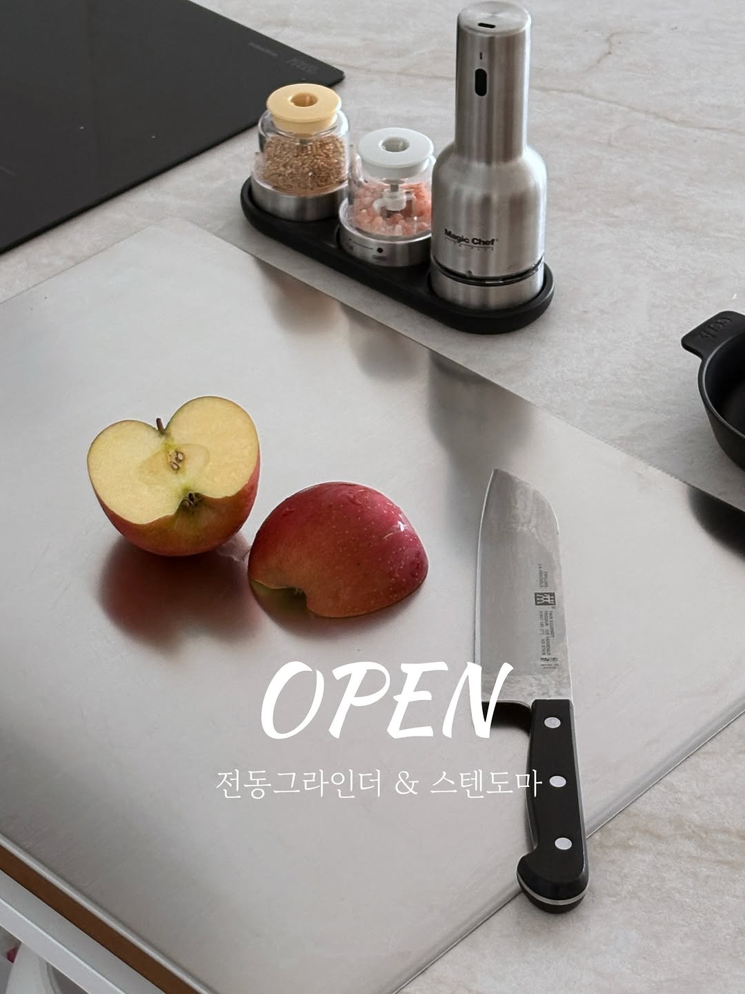 전동그라인더 + 올스텐도마 오픈했어요 📦공구기간 | 3.19(목) - 22(일) 🎀 구매완료 이벤트 ➖ 구매 후, 댓글로 구매완료 + 전화번호 뒷4자리 남겨주세요 ➖ 추첨을 통해 5분께 커피쿠폰 증정!! ⸻ ✅매직쉐프 전동 그라인더 👉 공구가 3만원대 (화이트,옐로우,핑크 +2000원) 컬러 (스텐실버, 화이트, 옐로우, 핑크) 구성 (본품 + 소금 1 + 후추1+ 트레이1) 300g 초경량, 소금통만한 사이즈인데 한 손에 쏙 들어오는 그라인더! 비싼 브랜드 부럽지 않은 스펙, 거품 빼고 스펙만 꽉 채웠어요👍 ✔ 의료용316스텐 > 염분에 강해서 부식걱정 NO ✔ 젖병소재 트라이탄 환경호르몬 걱정 NO ✔ USB 충전방식 한 번 충전으로 반년 든든 ✔ 5단계 분쇄 조절 소금 / 후추 / 깨 2초 교체 시스템 ✔ 깨팟 추가 시 3 in 1 (별도 옵션) ⸻ ✅스토피아 무연마 304 올스텐 도마 (40*50cm) 👉 공구가 2만원대 + 무료배송 304스텐에 고무 실리콘 없는 올스텐구조 녹에 강하고 세균번식, 곰팡이 걱정없이! 주방에 올려만 둬도 세련감성 팍팍 나는 도마 세척이 정말 쉽고 편리해요 😆 ✔ 녹과 변형에 강하고 ✔ 세균번식 걱정 적은 스텐 304소재 ✔ 색 / 냄새 배임 거의 없음 ✔ 조리대 걸침형 디자인 ✔ 조리대 / 해동보드로 활용 ✔ 베이킹 / 국수 반죽 작업대로 활용 ✔ 김밥 / 만두 대용량 작업도 거뜬 ✔ 식기세척기 사용 OK 고무 · 실리콘 없는 완전 올스텐 구조! #주방템 #살림템