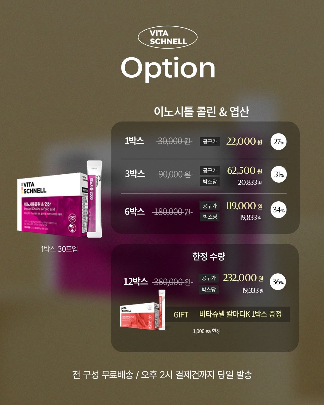 이노시톨 계의 에르메스 #비타슈넬 🍑🍊 1달분을 무려 만원대 𝙊𝙋𝙀𝙉 준비한 𝐄𝐕𝐄𝐍𝐓 ① 전체 무료배송 ② 선착순 100명 올리브레몬 듀얼샷 증정 ③ 선착순 1000명 12박스 구매 시 칼마디 증정 ④ 스토리 구매인증 추첨하여 100% 페이백 🔔할인율이 무려 36% ! 1박스당 19,300원 ! 후기만 수만개 + 평점 4.9 ⭐ 여자라면 다아는 비타슈넬 을 가져왔답니다 28살 자궁근종 수술 이후 6년째 빠짐없이 챙겨 먹는 게 이노시톨 인데 수십 개 브랜드 제품을 다 먹어보고 수백만 원을 버려본 제가 결국 정착한 제품! 🍋 ( 이 전 릴스 보셨죠 ? 안먹어본 브랜드가 없어요 ) 우선 왜 먹어야하는지를 알아야죠. 미오 이노시톨은 단순한 영양제가 아니라 우리 몸의 ’호르몬 스위치‘ 역할을 해요. 이 스위치가 꺼지면( 안 먹으면 ) ⚠️ 몸에서 이노시톨이 부족할 때 보내는 신호 ✔ 호르몬 균형 ✔ 생리불순 / 다낭성 관리 ✔ 폭식 / 단 거 땡기는 거 ✔ 살 안 빠지는 정체기 ✔ 탈모 / 털 굵기 변화 저는 이 증상들을 다 겪어봤기에 이노시톨만큼은 절대 끊지 못해요. 먹고 안 먹고의 차이가 삶의 질을 결정하거든요. 핵심은 “인슐린 + 호르몬” 산부인 의사 선생님들이 이노시톨을 늘 추천하는 이유가 여성들에게 가장 이로운 영양제 이기 떄문 ✔ 생리 주기 정상화에 도움 ✔ 임신 준비 여성도 섭취 가능 ✔ 난소건강 관리를 원하시는 분 ✔ 임신준비 하시는 분 ✔ 특히 PCOS(다낭성난소증후군) 이분들은 꼭 드셔주세요 ! 비타슈넬 미오이노시톨은 식약처에서 유일하게 인정했고 인체 적용 시험으로 검증된 이노시톨 40 : 콜린 1의 황금 비율 무너진 밸런스를 가장 빠르게 잡아줘요. ✔️ 하루 2포 독일산 미오이노시톨 4,000mg 섭취 ㄴ한번에 드시지 마시고 아침1포 , 저녁 1포 ✔️ 콜린100% → 지방대사 + 간 기능 + 붓기 ✔️ 엽산400㎍ DFE → 난소 건강 & 여성대사 건강 ✔️ Non-GMO 식물성 원료 사용 ✔️ 남녀노소 모두 챙길 수 있는 이노시톨 ✔️ 복숭아 & 오렌지 맛 순도 높고 흡수율 좋은 100% 독일산 미오-이노시톨로 내 몸의 스위치를 다시 켜주세요 ⭐️ ⚠️구매는 프로필 링크 클릭 - 일정: 4/13-15 7시 OPEN / 초특가는 6개월에 단 한번 !