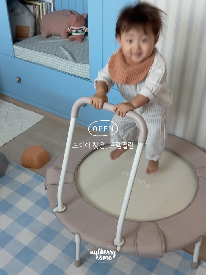 감성 트램펄린으로, 아이보리 컬러로 집 분위기를 해치지 않으며, 말랑한 손잡이와 TPR 발캡으로 안전성을 높였습니다. 사용하지 않을 때는 접어서 보관할 수 있습니다.