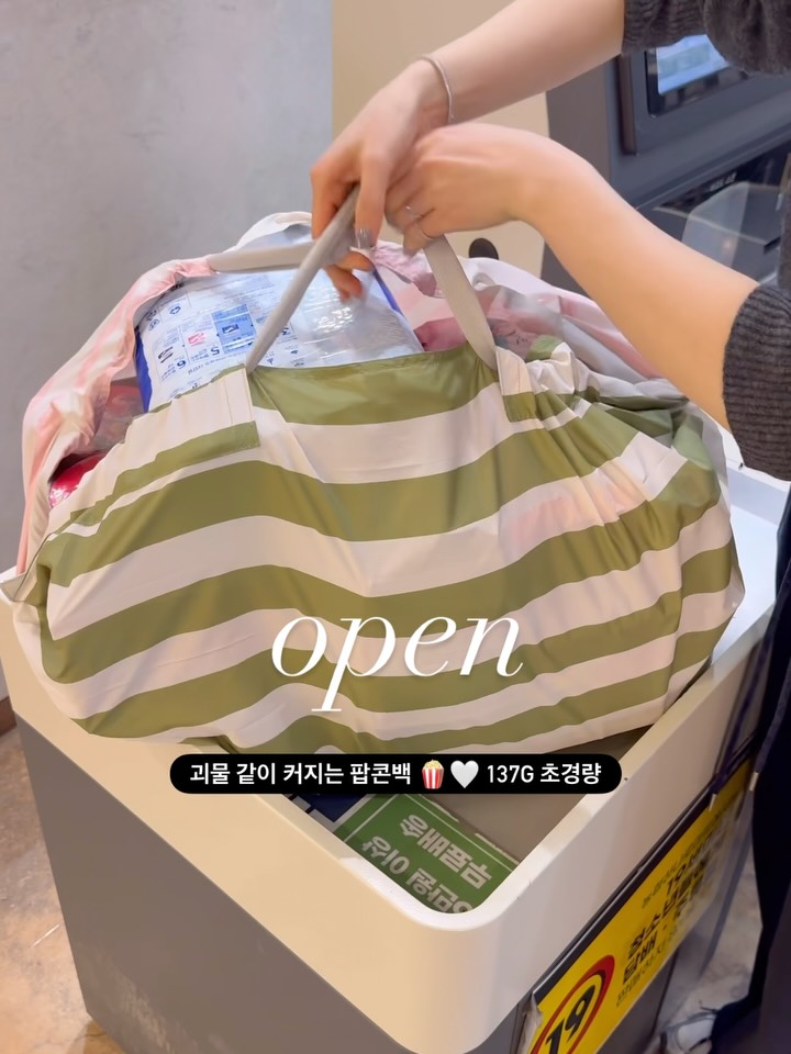 괴물처럼 커지는 팝콘백 🍿♥️ #오픈 #구매완료이벤트 #선착순이벤트 디어커스와 콜라보로 만든 팝콘백🍿 패키지부터 너무 귀엽죠? 종이컵만한 사이즈가 펼치면 괴물 용량으로 번신!! 당신은 미니멀 리스트? vs 맥시멀리스트? 모두에게 딱맞는 팝콘백 드디어 소개합니다🩵 오직 드엘리사 공동구매에서만 구매가능해요 💕🍿 ⏰ 공구 오픈 : 12.19 (금) 11시 📍 진행옵션(2가지) : 핑크 카키 스트라이프, 리버시블 네이비 역대급 이벤트도 준비했어요✨ 🎁선착순 100명 : 디어커스 혀자손 혀클리너 🎁구매 완료 총 170명 (댓글+휴대폰4자리) 🎈100명 : 디어커스 디퓨저 1세트 (2P) 🎈 20명 : 드엘리사 팝콘백 본품 🎈 50명 : 네이버페이포인트 3,000원 장 보러 나갔다가 장바구니 작아서 다시 비닐 받았던 적 🛍️ 여행 갈 때 ✈️ 기념품 잔뜩사고 현지에서 가방까지 산적 한 번쯤 있지 않나요? 팝콘백은 접혀 있을 땐 작고 미니멀한데 펼치는 순간 팝— 하고 터지듯 수납력이 살아나는 구조 🍿 ✔️팝콘백이 특별한 이유! 🎈 손바닥만큼 작게 접히고 🎈 카라비너 고리로 가방에 달아서 휴대 가능 🎈 팝콘처럼 펑🍿 펼치면 최대 40L 대용량 🎈 재활용 페트병으로 만든 친환경 원단🌱 🎈 생활 방수처리로 어느날씨에도 good 🎈 선물하기 좋은 예쁜 패키지 그 중 드엘리사 에디션은 핑크 카키 스트라이프라 양쪽으로 사용가능한 리버시블 디자인⭐ 장보기+여행 서브백+차 트렁크 안 비상백까지 휘뚤마뚤 사용하기 좋아서 ✔️ “있으면 좋겠다”가 아니라 ✔️ 있어야 편해지는 가방 🍿디어커스 팝콘백 x 드엘리사 에디션은 드엘리사 감성 가득한 포인트 주기 좋은 컬러 조합으로 데일리룩·여행룩에 들면 오히려 패션아이템이 되니까 꼭 하나씩 쟁여두세요! 미니멀리스트의 가방에 달리고, 맥시멀리스트의 하루를 담는 가방. 세상에서 가장 스타일리쉬한 장바구니! 드엘리사 프로필 링크에서 만나요 🤍 📦 배송안내 : 오후 1시이전 주문건 당일발송 📍 고객센터 : 디어커스 [네이버톡톡]
