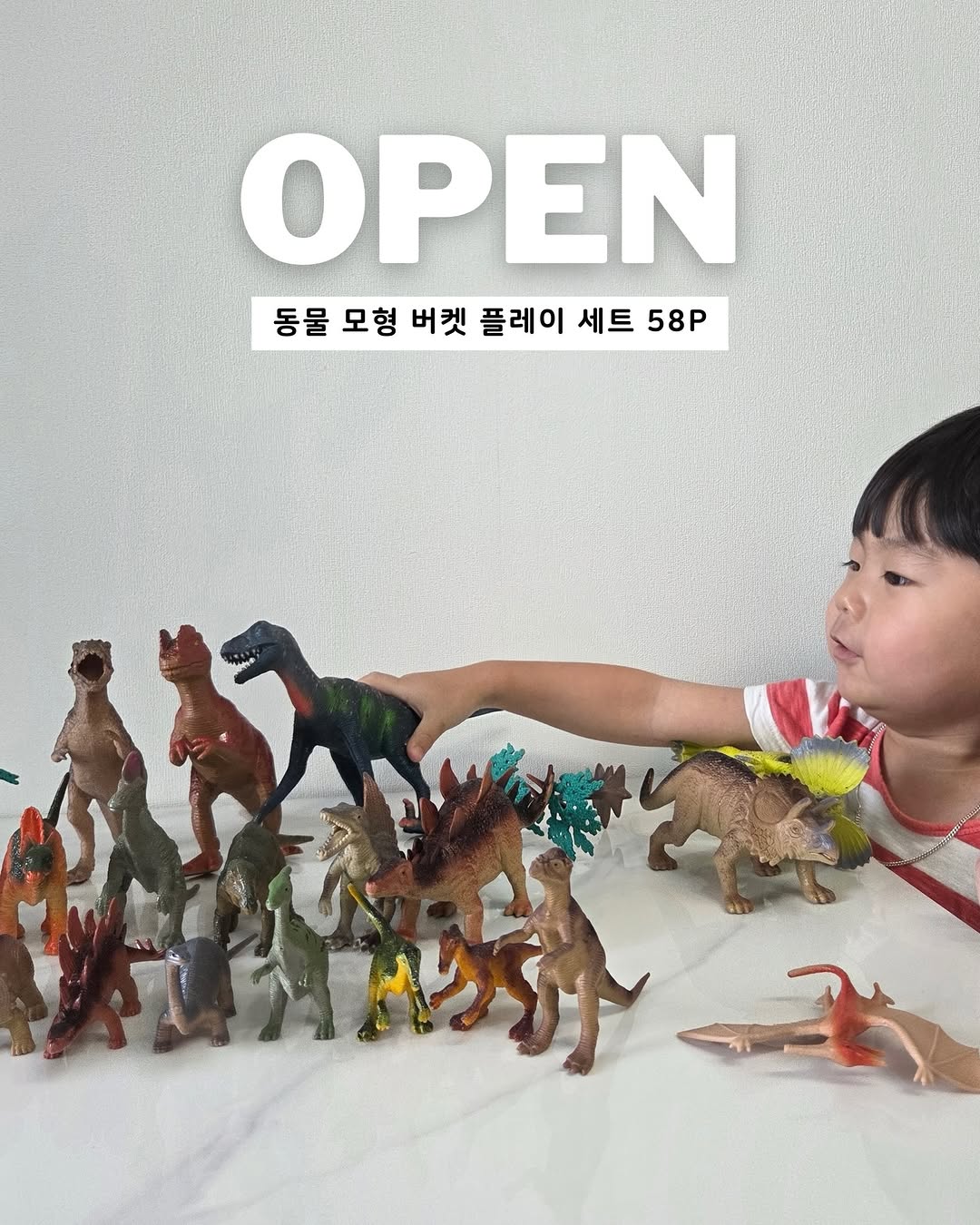 동물 모형 58종과 꾸미기 소품이 포함된 놀이 세트로, 아이들이 보고, 만지고, 놀면서 배울 수 있는 구성입니다.