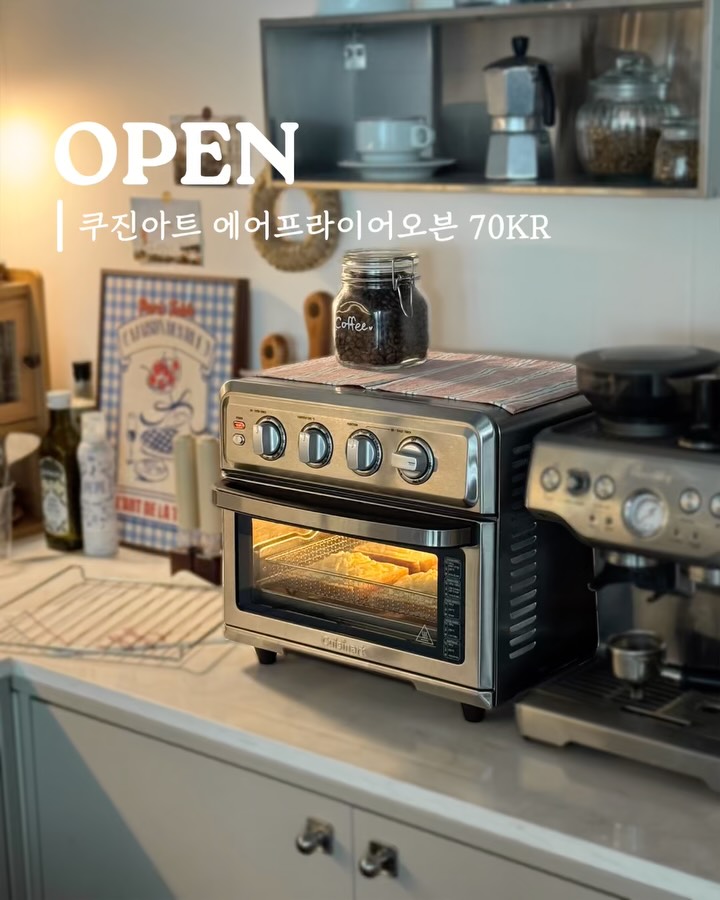 에어프라이어, 오븐, 토스터, 그릴 기능을 갖춘 쿠진아트 에어프라이어오븐 70KR. 공간을 절약하고 요리를 간편하게 도와주는 주방 가전입니다.