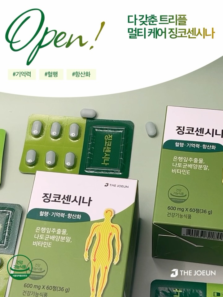 #공구오픈! 하루 1정으로 관리하는 [혈행, 두뇌, 세포]트리플케어 🌿 😀 🎁구매이벤트 총 10분 추첨하여 2개월분 해당하는 정가 85,000원 상당의 본품 1박스 보내드려요 매우 유니크한 배합의 [징코센시나🍀] 은행잎 추출물, 나토균배양분말, 비타민E 3가지 주원료로 ✔️기억력개선 ✔️혈행개선 ✔️항산화 트리플케어가 가능합니다 저도 놀랄 정도로 피드백이 좋은 제품인데요 ✅깜빡깜빡 기억력 감퇴로 걱정되는 분 ✅찐득한 혈액으로 원활한 혈행개선이 필요하신 분 ✅오랜시간 앉아있거나 서있을 때 다리가 붓는 분 ✅육류, 인스턴트 섭취가 많은 분 꼭 고려해보셨음 합니다. ⭐️혈행개선과 기억력에 도움주는 은행잎추출물 플라보놀 배당체가 최대함량 36mg ⭐️혈행개선 도움되는 나토균 배양분말이 최대함량 67mg ⭐️항산화역할을 하는 비타민E가 일일섭취량 100% 11mg 부원료로 센ㅇ아 성분이죠? 병풀추출물 100mg, 산사자까지 알차게 들어있어요 혈액순환 문제는 좌식생활 같은 ’현대인의 습관’에서 온 것이기도 해 관리로 충분히 좋아질 수 있어요🥹 🔻징코센시나 🔻생활습관 같이 노력해보자구요 🍃구성안내 1박스 (2개월분) 85,000원 ➡️ 55,000원 (35%off) 3박스 (6개월분) 255,000원 ➡️ 147,000원 (42%off) 6박스 (12개월분) 510,000원 ➡️ 255,000원 (50%off) ⬆️ 최다 구성 선택시 1개월분 21,250원⭐️ 🍃섭취방법 1일 1회 1정 식사관계없이 편한시간에 섭취