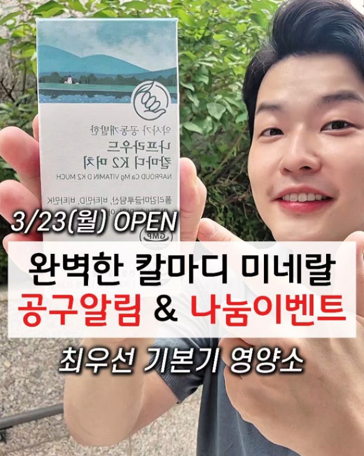 🔻공구알림 & 나눔이벤트 안내사항🔻 "드디어" 완벽한 칼마디 미네랄을 찾았습니다. ✅️ 우리 몸을 구성하는 칼마디 미네랄 ▪️ 너무 많아 나열하기 조차 힘든 ➡️ 수 많은 역할들이 있습니다. "나프라우드 칼마디K2 머치" 📍 나프라우드 칼마디의 특징은 ▪️ 속이 편하고 흡수율이 높습니다 ▪️ 각각의 성분을 전부 프리미엄 원료로 넣었습니다 ▪️ 알이 작아 삼키기가 편합니다 ▪️ 알을 못드시면 씹어드셔도 문제 없습니다. 싸구려 흡수 안되고 속쓰린 미네랄과는 차원이 다른 효과를 보여줍니다. 단점이라고 하면 .. 딱 하나 아무래도 비싼 가격이었는데 ➡️ 공동구매 최대 할인으로 준비했습니다. 📍 이런 분들께 추천드립니다 ▪️ 정상적 뼈 형성 및 유지가 걱정이신분 ▪️ 에너지 이용을 개선하고 싶으신 분 ▪️ 면역력을 개선하고 싶으신 분 ▪️ 신경과 근육의 정상적 기능을 원하시는 분 ▪️ 심한 스트레스로 휴식이 필요하신 분 ▪️ 유해산소 제거가 필요하신 분 ▪️ 커피나 술을 즐겨 드시는 분 ▪️ 어린이부터, 임산부, 어르신까지 ➡️ 온가족이 함께 드실 수 있는 미네랄입니다. 🔥1순위 필수 영양소🔥 ➡️ "칼마디 미네랄" 공동구매는 3/23(월) ~4/1(수) 예정입니다. 📍 댓글에 공구알림 적어주시면 ▪️ 랜덤으로 5분 추첨해서 "선물" 보내드릴게요 ▪️ 선착순 아니구요. 회사(나프라우드)에서 뽑습니다 ➡️ 본 공동구매 때 대형 구매 이벤트 함께 옵니다 :) 📍 공동구매 구성 ✔️ 2박스 : 정가 102,000 >> 공구가 79,000 (23%) ✔️ 3박스 : 정가 153,000 >> 공구가 115,500 (25%) ✔️ 5박스 : 정가 255,000 >> 공구가 177,000 (31%) 항상 감사드립니다. 더 좋은 정보와 제품으로 보답 드리겠습니다. #미네랄 #칼마디 #칼마디공구 #미네랄공구 #나프라우드칼마디 @yak_secret Q) 미네랄이란 이름 이제는 어렵지 않으시죠?