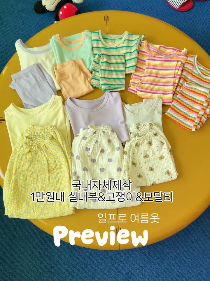 국내 자체제작으로 질 좋고 예쁜 여름옷을 1만원대에 제공합니다. 다양한 구성의 실내복과 바지로, 사이즈는 3호부터 11호까지 준비되어 있습니다.