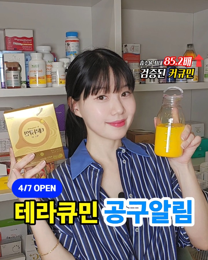 ❣️<테라큐민> 검증된 커큐민! #공동구매 일정 안내드려요! 📍❣️ 🔔 댓글알림⭕ 알림 필요하신 분은 알림댓글 남겨주세요! 저도 23년 7월 첫주문을 했었는데 어느덧 3년이 다 되어가는 ㅎㅎ 이제 참으로 익숙한 <테라큐민> 공구일정 자세히 안내드려요!🙏💗 원물째 갈아먹는 강황가루와 달리, 오직 강황에 있는 커큐민 성분만 담았습니다! 매 제조번호별로 커큐민 함량을 까다롭게 관리하구요! 강황 속의 핵심 유효성분 ‘커큐민’은 흡수율이 굉장히 낮아(1~2%대) 대부분 배출되는데 <테라큐민>은 이 한계점을 극복해내, ✔️미세입자화로 물 분산성을 높이고 ✔️장 부착을 용이하게 하는 기술력으로 ✔️흡수율을 최대 85.2배 높이고 ✔️풍부한 임상을 보유한 ✔️전세계적 특허커큐민이에요 인도산 강황에서 얻은 귀한 커큐민 원료를 사용합니다! [ 공구 일정과 혜택 ] ▪️최대 54% 할인율! 🎁최다구성 구매하신 분 랜덤추첨 (가루/알약 총10분) 1박스 보내드리는 이벤트! ▪️일정 : 4월 7일 화요일 오전 10시 Open▪️ ▪️제품명 : 테라큐민 슈퍼플러스100 / 테라큐민 맥스60▪️ ▪️댓글알림 : 알림이 필요하시면 댓글을 남겨주세요▪️ [공구 구성] ▪️테라큐민 종류 ✅테라큐민 슈퍼플러스100 (물에 샤악 녹는 가루) ✅테라큐민 맥스60 (조그마한 알약형) 1️⃣ 테라큐민 슈퍼플러스100 흡수율을 42.6배 높인 가루 스틱형태 ✔️테라큐민슈퍼플러스100 1포 =강황가루 155g 1박스=60포 (2개월분, 하루1포섭취) 그대로 입안에 털어넣거나, 물에 타서/음료에 타서 밥지을 때, 요리할 때 활용할 수 있어요🍚 2️⃣ 테라큐민 맥스 60 흡수율을 85.2배 높인 작은 알약형태 ✔️테라큐민맥스60 2정 = 강황가루 186g 1박스=60정 (1개월분, 하루2정섭취) 위생적으로 가지고다니면서 간편하게 챙기세요! 🔻이런 분께 특히 추천드려요!🔻 고품질의 프리미엄 커큐민 원료섭취가 필요하신 분 자도자도 피곤하신 분 건강체질로 변화하고 싶으신 분 부모님 선물이 고민이신 분 잦은 회식으로 건강이 염려되시는 분 피로한 가족을 위한 건강식품이 필요하신 분 🫚커큐민은? 강황의 메인 유효성분인 커큐민은 1970년대부터 연구가 시작돼 22,000건이 넘는 데이터가 있고 건기식 메인시장인 미국시장에서도 그 위상이 대단합니다! 이런 커큐민을 제대로 섭취하려면, 커큐민의 함량과 흡수율이 가장 중요합니다! 커큐민은 방대한 연구결과를 가지고 있습니다! 커큐민 효능은 검색창에 “커큐민 효능” 찾아보시면 아주아주 다양한 자료들이 자세히 나와있으니 검색해보시면 더 도움되실거에요! 👏 ⭕댓글알림 : 기다리시는 분들은 댓글을 남겨주세요⭕ 4월 7일 화요일 오전10시에 뵐게요! 감사합니다! ☺️