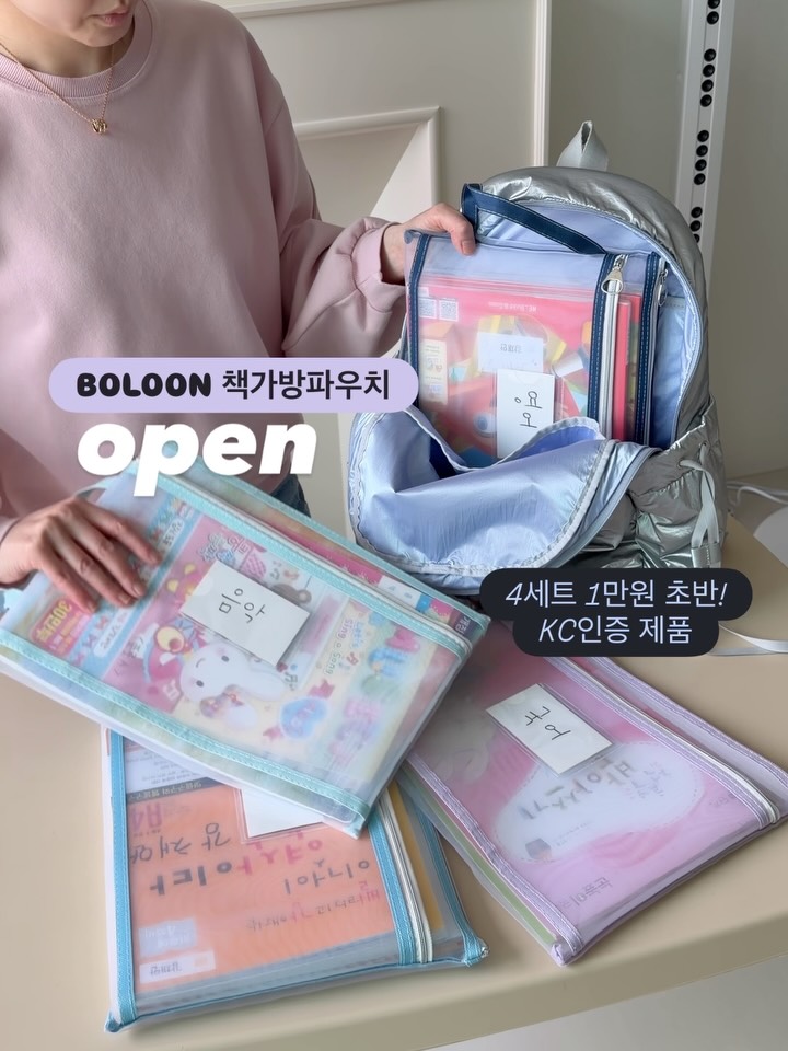ꔚ공구오픈ꔚ 책가방 정리 꿀템! Boloon 책가방파우치📚 평일 오전 9시까지 당일출고라 주말 내 받아보실 분들은 바로 주문 주세요! 📌댓글에 ‘링크’ 남겨주시면 최저가링크 바로 보내드릴게요📩 첫째가 초등학교 들어가니🏫 매일 책가방에 교과서, 방과 후 교재&준비물, 학원책 등등 정신이 없더라구요😵💫 저도 아이도 매일 너~무 헷갈려서 좋은 방법 없나 찾다가 이걸 발견했어요‼️ 메쉬소재 파우치인데요🗑️ 이 책가방파우치에 과목별로 구분해 넣어두니 아이 스스로 찾기 쉽고 가방에 쏙 넣기도 좋더라고요🤌 사이즈 큰 책도 들어가고, 책 여러권 넣어도 넉넉한데📚 과목별로 인덱스에 이름 적어 넣어두면 가방 속에서도 섞이지 않아 학원가서 책 찾기도 편하대요🤗 저희는 평소 가방걸이에 걸어 두는데, 아이 스스로 책 찾아 숙제하고 숙제 다 하면 다시 걸어두고- 바쁜 아침에 바로 가방에 쏙 넣으면 되니 정말 편해요👍 💟파우치 4개 세트 : 12,500원 (정가 16,500원) 새학기 필수템이라 인기가 너무 많아 재입고 오래 기다려 가져왔어요🙌 수량 있을 때 챙겨가세요! ⚠️6세 이상 KC인증 받은 제품입니다! 유사 제품들 중 인증 없이 판매되는 제품들이 많은데, 믿고 구매하셔요😊 ✅공구는 ~4/6(월) 자정 마감! 🚚평일 오전 9시 전 당일출고 🎁구매완료이벤트 구매 후 댓글에 ‘구매완료+폰뒷번호4자리‘ 남기고 가세요! 추첨을 통해 [스타벅스 커피쿠폰] 보내드릴게요☕️ #째째홈 #책가방파우치공구
