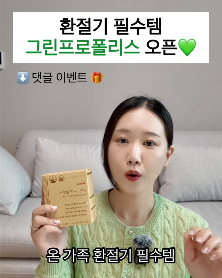 💚 환절기 필수템 그린프로폴리스 오픈 💚 #공동구매 환절기 필수템 그린프로폴리스 오픈했습니다🤗 그린프로폴리스는 환절기인 봄, 가을에만 공구 열어드리는 제품이에요! 일년에 딱 2번 열어드립니다❣️ 그러니 필요하신 분들은 미리 쟁여두세요😉 이 제품을 고른 이유는 아래와 같아요 :) 1️⃣ “그린”프로폴리스가 들어가있는 점 그린프로폴리스에는 “아르테필린C”라는 성분이 함유되어있는데, 이건 효능 찾아보시면 깜짝 놀라실겁니다🤓 2️⃣ 검증된 그린프로폴리스 시중에 이름만 그린프로폴리스인 제품도 많은데요, 브라질정부의 공식 S.I.F 인증을 받았어요 3️⃣ 면역력 증가에 도움이 되는 아연, 비타민C 함유 4️⃣ 섭취하기 쉬운 캡슐 형태 5️⃣ 플라보노이드 20mg 함유 ✅ 공구 가격 ( 1박스 - 1달분 / 30캡슐 ) 🔹 4박스 - 정가 : 100,000원 ➡️ 62,000원 ( 38% 할인 ) 🔹 7박스 - 정가 : 175,000원 ➡️ 99,900원 ( 43% 할인 ) 다음 공구는 6개월 뒤에 열어드릴 예정입니다^^ 🔸 섭취 방법 : 하루 1알 식후 섭취 🔸 적극적으로 섭취하고 싶은 분들은 2주 정도 2알씩 드세요 🔸 임산부, 수유부는 권해드리지 않아요 🔸 24개월 이상이면 하루 1알 드실 수 있어요 (캡슐을 못 삼키면 안에 가루만 먹이셔도 됩니다 ) ✅ 소비기한 : 27년 7월 22일 🎁 댓글 이벤트 🎁 ( 핸드폰 뒤 4자리도 적어주세요 ) 1️⃣ 재구매하는 분들은 “짧은 후기” 적어주시거나 2️⃣ 처음 구매하는 분들은 “구매 완료” 적어주시면 추첨을 통해 그린프로폴리스 1박스를 선물로 드려요^^ 환절기 온가족 건강에 도움되셨으면 좋겠습니다😇💚