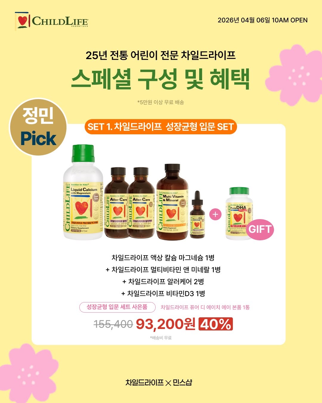 #차일드라이프 🔥최대 49%할인‼️ ⏰ 내일 오전 10시 다들 대기 타셔야 합니다… 진짜로요 🔥🔥 선착순 50명 🎁비타민D 본품 1병 증정이벤트 있습니다!!! 이번에 선착순 진행 어렵다는거 제가 직접 사비 털어서 더 준비했어요!! 이왕이면 비타민D 꽁짜로 받아가세요😉🎁🎁🎁 그런데 여러분📢 이번에 #차일드라이프 혜택 진짜 장난아니에요 ➡️12만원 이상 주문 시 🎁비타민C 본품 증정 ➡️15만원 이상 주문 시 🎁비올란 아몬드오일 증정 ➡️성장균형 입문세트 주문시 🎁퓨어DHA 증정 여기에 끝이 아닙니다… #구매완료이벤트 당첨시 🎁알러케어 본품 증정까지 만약 15만원 구매시? 선착순도 당첨되고 구매완료까지 당첨됐다??? 🟡비타민D 본품 🟡비타민C 본품 🟡비올란 아몬드오일 🟡알러케어 본품 사은품만 다 가져가버리는 거에요~🎁 진짜 최저가인데🔥 사은품까지 어마어마한 혜택이라 무조건 공구기간에 구매하시는 걸 추천드릴게요 ⭐️ 차일드라이프 온라인 공식 판매처 ⭐️ 공식 유통 제품으로 안심하시고 주문하세요! 🌎 하루 136억 개 판매! 글로벌 어린이 영양제 브랜드 1위🏆 액상 제형으로 흡수율 최고 무첨가 원칙 (글루텐❌우유❌계란❌) NON-GMO 인증 / FDA 인증 시설 제조 (국내 수입 제품 식약처 인증) 아이들 먹는 영양제만큼은 ⭕️건강기능식품인지 ⭕️믿고 먹일 수 있는지 ⭕️검증된 브랜드인지 꼭 비교해보세요! 수많은 엄마들의 후기와 인증으로 이미 검증된 #차일드라이프 민스샵 특별 공구혜택으로‼️ 꼭 만나보세요
