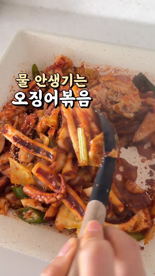 🦑물없이 오징어볶음 오징어는 냉동실에 항상 떨어지지 않게 쟁여둬요. 저희 딸도 좋아하고, 남편도 좋아해서~ 반찬거리 마땅치 않을 때 그냥 휘릭~ 볶아내면 딱이니까요😉 오징어볶음 핵심은, ✔️양념국물 좀 넉넉하게 해서 소면사리 같이 먹느냐 ✔️국물없이 오징어에 양념 착! 해서 먹느냐 이번에는 국물없는 버전입니다! 국물 많이 안생기게 만드는 핵심은 딱 2가지!! ☝🏻오징어를 먼저 데치거나 무수분으로 굽거나 ✌️채소는 불맛나게 센불에서 바싹 볶아주기 ✅오징어볶음 양념장 (오징어 큰거 2마리 기준) 간장1 굴소스1 고추장1 마늘1 맛술1 설탕1 고춧가루3 후추톡톡 오징어는 마른팬에 넣고 찌듯이 한번 구워내고, 팬에 나온 물은 버려주세요! 기름 넉넉히 두르고 파기름 내다가 양배추, 양파 센불에서 휘리릭~ 노릇하게 구운 뒤 중불 낮춰서 오징어+양념장 넣고 볶아주면 끝! 그럼 오징어에 양념이 착! 밥반찬으로 만들었는데 반주 한잔 절로 생각나는 오징어볶음 레시피 되시겠습니당..ㅎㅎ 🦑이번에 산 오징어는 얼마 전 @yangfood81 에서 국산 특대형 오징어를 할인판매 하길래, 오징어러버로서 바로 겟!한 오징어였는데요😆 아니 근데 사이즈가 진짜 어마무시!! 살밥이 두툼~해서 이거 진짜 쫄깃하고 먹을거 있더라구요!! 2마리로 오징어볶음해서 4인가족 배터지게 먹을 썰 ㅋㅋ ✨영상 속 오징어볶음 만든 사각팬은 바첸 쿠커블웨어! ⏰오늘 자정까지만 링크 열어둘게요! 놓치지 마세요😆 ✨영상 속 밧드는 세상에 없던 완벽밀폐 브루클린 316스텐밧드! 📆4.21(화) 내일 만나요! (오늘 밤에 프리뷰 간단하게 보여드릴게요!) 그럼 이번 한주도 화이팅 하시길 바라며🙌 우리님들 행복하고 즐거운 봄날 되시어요!! #오징어볶음 #오징어볶음레시피 #집밥 #레시피 #바첸공구