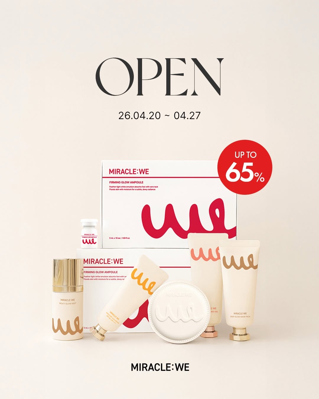 MIRACLE:WE 코스메틱이 4월 20일 오전 10시에 오픈됩니다. 1+1 이벤트로 동일 제품을 하나 주문하면 하나가 더 제공됩니다.