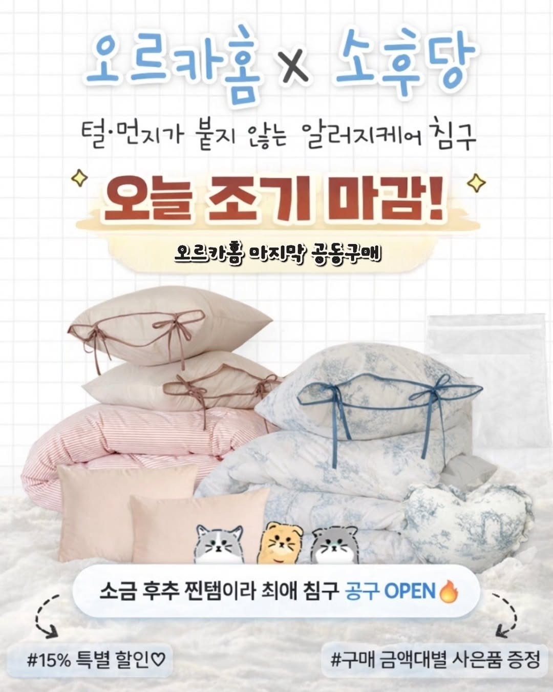 🚨 오르카홈 침구 3일 앞당겨 조기종료 안내드립니다 🚨 브랜드사 사정으로 오늘까지만 진행되고 이번 공구가 마지막이 될 가능성이 높아요🥲 망설이셨던 집사님들… 오늘이 진짜 마지막이에요!!! ⏰ 오늘 밤 11시 59분 마감 (연장 없음❌) 고민하셨던 집사님들은 막차 탑승해주세요🫶 ▪︎댓글에 '마지막' 남겨주시면 최저가링크 보내드릴게요!