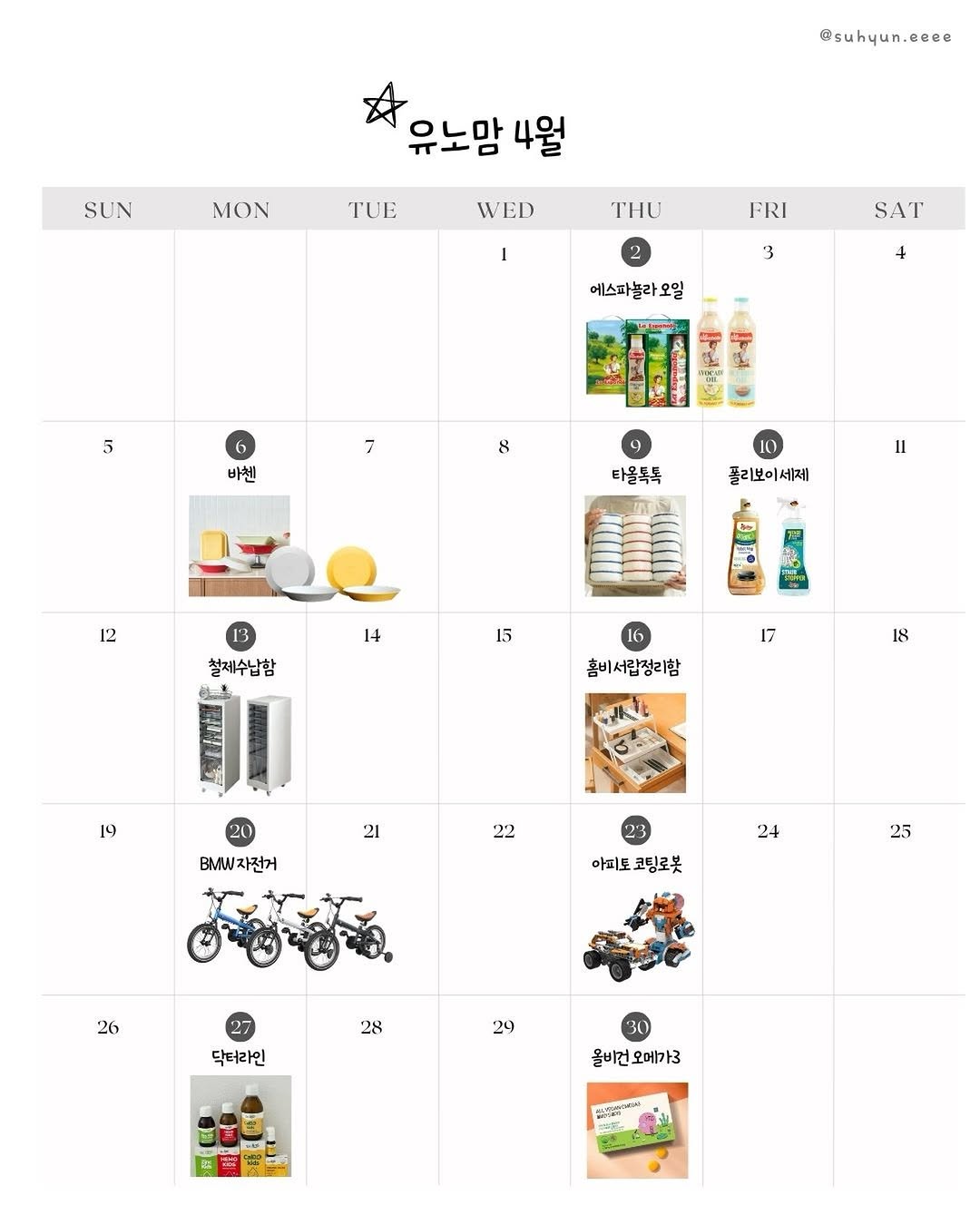 #유노맘공구일정 26년 4월일정 공유드립니다 필요하신 제품이나 관심있으신 제품 댓글로 남겨주세요!!😆 10분께 커피쿠폰 보내드릴게요☕️ ✔️2일(목) 🫒에스파뇰라오일스프레이 → 스페인 에스파뇰라 골라담기 할인전 ✔️6일(월) 🥣바첸 쿠커블웨어 → 인기주방템 세라믹팬, 접시 그대로 요리 + 그대로 플레이팅까지 ✔️9일(목) 🧺타올톡톡 → 100% 국내생산, 100% 순면타올 가성비 좋은 수건 ✔️10일(금) 🧽폴리보이 세제 → 오가닉 로봇청소기 전용세제 & 정전기 먼지방지 클리너 ✔️13일(월) 🗄️철제수납함 → 자잘한 물건도 한눈에 보이게 정리가능 ✔️16일(목) 🗃️홈비 서랍정리함 → 서랍 속 공간을 창조하는 계단식 서랍정리대 ✔️20일(월) 🚲BMW 키즈바이크 → 우리아이 첫 자전거, 독일 명품 BMW 키즈바이크 ✔️23일(목) 🤖아피토 코팅로봇 → 첫 코딩 입문용 추천! 어린이날선물추천 ✔️27일(월) 💊닥터라인 키즈영양제 (철분,아연,칼슘,비타민D) → 유럽 프리미엄 키즈영양제, 완제품직수입제품 ✔️30일(목) 🌱올비건 오메가3 → 말랑말랑 맛있고 비리지 않는 노르웨이 식물성 올비건 오메가3 * 공구일정은 변동될 수 있습니다 ^^