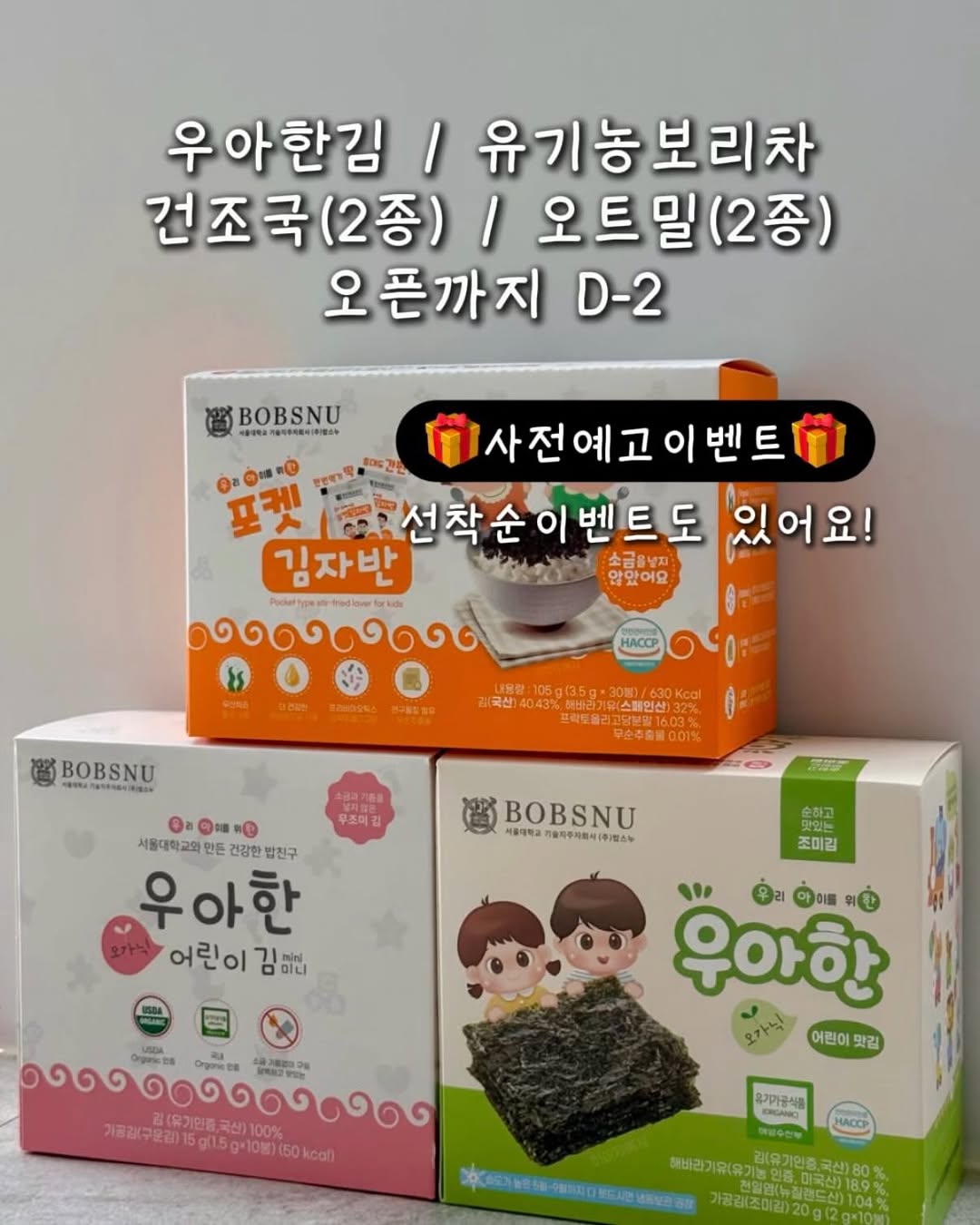 #공구예고 [밥스누] 우아한 아기김 6차 🎁사전예고이벤트🎁 [알림] 또는 [아기김] 편하신 댓글을 남겨주시면 추첨을 통해 [에디슨롱뻥 6개]를 선물로 보내드릴게요! (또후니맘 태그 후 스토리 공유시 당첨확률 UPUP) 📣 이번에는 선착순이벤트도 준비해왔어요! 선착순 20분에게 [조미김 1케이스]를 추가로 보내드릴게요✨ 구매 고민하셨다면 오픈런하셔서 선물까지 받아가세요! ——————————————— 오랜만에 찾아온 이유식&유아식 필수템인 [우아한김] “아이는 자고로 김으로 키운다“라는 말 많이 들어보셨죠? 김 하나만 있으면 입맛없던 아이도 밥한공기 뚝딱! 밥태기를 뿌시는데에는 [김]만한게 없는 것 같아요🥹 또후니 첫김으로 선택한 제품이 [우아한김]이였어요! 다양한 아기김 중에서 가장 안심하고 먹일 수 있는 제품이었고 2년 넘도록 내돈내산 너무 잘 먹는 아기김이에요♥️ 아기김 고를때 제가 중요하게 생각했던 포인트는 ▪️염산처리를 하지 않은 [유기김(유기농돌김)]인지 ▪️유전자조작을 하지 않은 유기농 기름을 사용했는지 ▪️소포장 되어있는지(맛변화방지/산화방지/편리한휴대) ▪️유기농인증 등 제품의 품질을 보장 받을 수 있는지 위 기준에 가장 적합했던 제품이 [밥스누 우아한김]이에요‼️ 우리아이 첫김으로 어떤 제품을 선택해야할지 고민이시거나 좀 더 건강한 김으로 바꿔서 먹이고 싶으신분들께서는 꼭 한번 살펴봐주세요! 우리아기 밥태기도 뿌셔봐요🔥 ——————————————— 📌 밥스누 우아한 김이 특별한 이유 ✅ 서울대학교기술지주자회사 밥스누와 만든 건강한 아기김 ✅ 염산(유기산, 화학물질)처리를 하지 않은 유기김 ✅ 전통유기방식으로 까다롭고 느리지만 건강하게 생산 ✅ 까다로운 미국농림부유기인증 제품 ✅ 유기가공식품인증 받은 [찐유기농제품] ✅ HACCP인증 시설에서 위생적으로 제조 ✅ 연2회 정기적 방사능검사 ✅ 소포장으로 눅눅해지거나 맛의 변화없이 섭취가능 ✅ 외식/모임/캠핌/여행/나들이 등 휴대&보관편리 📌 어린이김 종류 ▪️무조미김(8개월부터) : 이유식부터 가능, 소금&기름 없이 김 100% ▪️조미김(돌 이후부터) : 뉴질랜드천일염, NON-GMO유기농 해바리기유 사용 ▪️포켓김자반(돌 이후부터) : 소금&설탕 무첨가, 프락토올리고당으로 건강한 단맛 그외에도 유기농 보리차 / 1분 포켓국 / 오트밀죽까지 준비했어요! ——————————————— 📍공구기간 : 4월 14일(화)-17일(금) / 4일간 📍구매방법 : 프로필(@ddohuni_mom)링크통해 구입가능 📍댓글로 알림신청 남겨주시면 답글로 알려드릴게요⏰ #우아한김 #밥스누우아한김 #우아한김공구 #아기김공구
