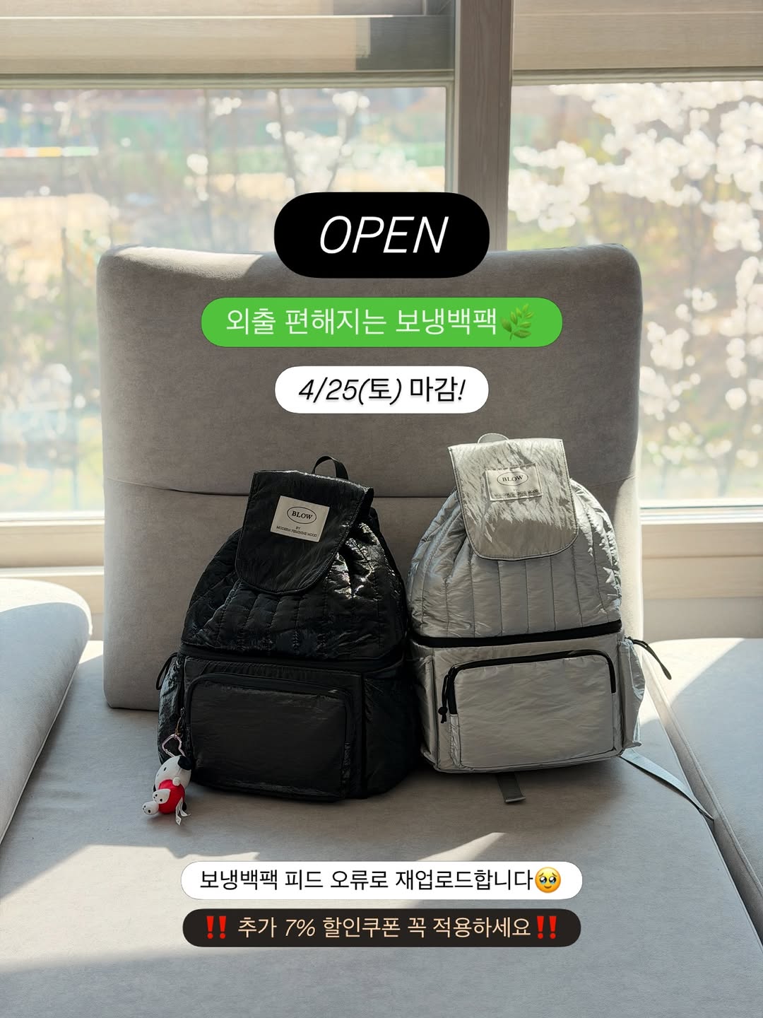 아이와 외출이 달라지는! 블로우 보냉백팩 𝙊𝙋𝙀𝙉 🖤 이전 오픈피드에 남겨주신 구매인증 기록해서 추첨합니다🙌🏻 ☝🏻☝🏻더 많은 상세사진은 스토리 하이라이트 봐주세요 ‼️7% 할인쿠폰 꼭 적용하세요‼️ 댓글로 [링크] 남겨주시면 DM으로 최저가 구매링크 보내드릴게요✨ 🎁 구매인증 이벤트 🎁 ‘구매완료+휴대폰 뒷4자리’ 댓글 달아주시면 3분 추첨해서 [강아지 키링] 보내드릴게요🫰🏻 ﹋﹋﹋﹋﹋﹋﹋﹋﹋﹋﹋﹋﹋﹋﹋﹋ 🖤 블로우 보온보냉 팝 백팩 (2 in 1) ✅ 촌스럽지 않은 디자인! 아빠엄마 모두 잘 어울려요 ✅ 수납과 보온보냉이 한번에 되는 2in1 가방 ✅ 350g 초경량, 어깨끈 쿠션감, 생활방수 가능 ✅ 실내 온도 22도 기준 보냉, 보온 70% 6시간 가능 ✅ 국내자체 제작 상품 🖤 공구품목 ✔ 5가지 색상 : 유광 블랙, 실버 ✔ 스웨이드 : 블랙, 모카부스, 버건디 ﹋﹋﹋﹋﹋﹋﹋﹋﹋﹋﹋﹋﹋﹋﹋﹋ 기저귀 가방 유목민들 여기 모여주세요 가벼우면서, 양손 자유로운 백팩에, 수납력도 좋고, 보온보냉까지 있는 깔끔하고 예쁜 보냉백 소개해드릴게요😍 작년가을 처음 보여드렸을 때 오픈하자마자 품절된 그 가방! 아이랑 나들이갈 때 특히 손 많이가고 이것저것 챙겨나가도 찾기 쉬워서 정말 편리한 가방인데요🌿 저는 작년가을부터 쭉 쓰는데 가볍고 수납 넉넉해서 어디 놀러갈 때 꼭 들게 되더라구요! 아이랑 같이 있으면 먹을거 챙겨주랴 물티슈 끄내랴 기저귀까지 찾으랴 ~ 진짜 내내 가방 뒤지기 바쁘잖아요🫠 이 백팩은 위 아래가 분리되어 있으니 ✔️ 물건 찾기도 쉽고, ✔️✔️ 꺼내주기는 더 쉬워서 너무 좋더라고요 앞주머니랑 사이드포켓도 있어서 차키, 립스틱, 핸드크림, 썬크림 등 넣기도 좋습니다!! 보통 저는 보냉칸에 아이 간식, 간단한 도시락 담아서 외출하는데 계절에 상관없이 사용할 수 있어서 좋았어요 가까운 외출에는 이유식도 따뜻하게 챙겨나갈 수 있으니 넘 좋죠:) 혹시 보온·보냉 기능이 필요하지 않다면, 아기 간식용 가방으로 써보세요 아래칸에 간식이나 과일칩, 떡뻥 등을 넣으면 부서지지 않고 모양 그대로 챙겨줄 수 있어요 가볍고 실용적인데 예쁘기까지..💓 아빠가 메도 잘 어울려서 더 좋아요!! 외출할 때마다 기분까지 좋아지는 가방으로 즐거운 외출 해보세요🎈 ﹋﹋﹋﹋﹋﹋﹋﹋﹋﹋﹋﹋﹋﹋﹋﹋ 📍 기간 : 4월 23일(목)~25(토) 📍 배송 : 무료배송 ﹋﹋﹋﹋﹋﹋﹋﹋﹋﹋﹋﹋﹋﹋﹋﹋ 사전예고 이벤트 당첨❤️ 당첨자 @hsneeee9394 @jung._.ing @sseonuu11 궁금하신 점 있으시면 언제든 댓글이나 디엠 보내주세요 감사합니다💓