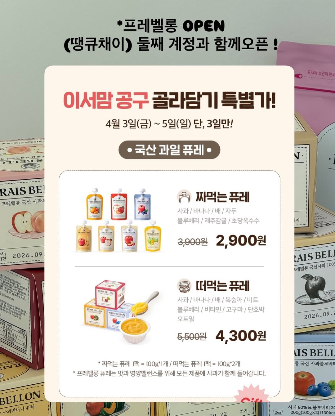 #구매인증여기에 프레벨롱 퓨레 • 간식 골라담기 모음전 ⭐️댓글에 ‘링크’ 남겨주시면 오픈시 자동DM으로 구매링크 전송드릴게요 ✅구매 선착순 ‘30명’ 짜먹는퓨레 랜덤 1증정 ✅구매완료 이벤트 구매완료+ 전화번호 뒷 네자리 남겨주세요 추첨을 통해 철분강화 오트밀 또는 네이버페이 5천원권 선물 보내드릴게요 _______________________________________ 21년도에 첫째이서, 25년도에 둘째 채이 이유식하며, 무슨일이 있든 이유식, 간식은 직접! 만들어먹이는데 퓨레는 직접 만들어준건 절대 안먹더라구요 -? 많은 브랜드 중에도 프레벨롱을 선택한 이유는 잘먹는것도 정~ 말 중요하지만 , 첨가물 없는 100% 과일채소로만 만들어 졌다는 점! ⭐️프레벨롱 퓨레 (짜먹는퓨레 떠먹는퓨레) ✅ 첨가물 없는 100% 원재료 ✅ 100% 국내산 과일, 채소 ✅ BPA-Free 용기로 환경호르몬X ✅ 저온살균과 특수진공포장 ✅HACCP 인증 •공구구성 및 가격 짜먹는 퓨레 3,900원 > 공구가 2,900원 (사과/배/ 바나나 / 자두/ 블루베리 / 제주감귤/ 초당옥수수) 1팩 = 100g 파우치 떠먹는 퓨레 5,500원 > 4,300원 (사과/바나나 / 복숭아/ 블루베리/비트/비타민/ 고구마/ 단호박) •1팩 = 100g 2컵= 총200g ⭐️모든 제품에 사과가 포함되어있어요 ⭐️프레벨롱 말랑고구마 ✅100% 고구마 , 첨가물 X ✅꿀 고구마라고 소문난 ! 베니하루카 고구마! ✅ 전자렌지 10초 정도 돌려주면 더 부드러워 돌전 아이들도 먹일수 있어요 ! ( 그래도 옆에서 지켜봐주세요!) ✅공구가 안내 말랑고구마(1박스 x 10개입) * 2박스 27,800원-> 22,900원 * 4박스 55,600원 -> 42,900원 ⭐️더 ~ 오래먹는 유기농 롱떡뻥 ✅사과/시금치/비트 ✅1봉 3,500-> 2,500원 ⭐️유기농 순수 보리차 배도라지즙 ✅20팩 25,800원-> 18,900원 ✅40팩 51,600원-> 34,900원 🗒️일정 4/3(금)~ 4/5(일) 단 3일간! 16,000원 이상 무료배송 오후 13시 이전 당일 출고이나 주문 폭주시 기존 일정보다 1~2일 지연 예상됩니다! 📒배송 및 CS문의는 카카오톡 프레벨롱 채널