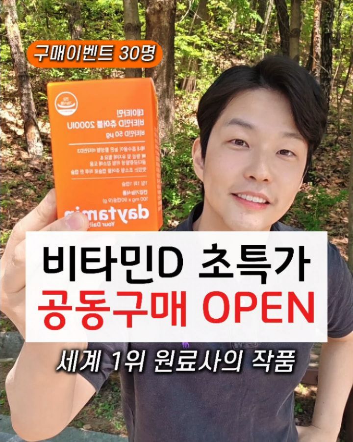 🔻비타민D 특가 공동구매 안내사항🔻 완벽한 품질에 파격적인 가격 "데이타민 비타민D3 2000iu" 🎉초특가 공동구매 오픈합니다🎉 ➡️ 4/27(월) ~ 5/3(일) 하루 100원에 몸을 지키는 압도적 가성비 영양소 "비타민D" 필수 영양소인 비타민D를 온가족이! 누구나! 부담없이 섭취하실 수 있도록 만들어진 제품입니다 😃 ✅️ 이런 스펙을 가지고 있습니다 ▪️ 세계 1위 비타민D 원료사 DSM원료 ▪️ 생체 이용율이 높은 비타민D3 형태 ▪️ 산패 방지를 위한 개별 포장 ▪️ 1알당 2000iu 가득찬 함량 ▪️ 파인애플맛 맛있는 초소형 츄어블 ✅️ 이런 분들께 추천 드립니다 ▪️ 몸의 방어시스템 정상화가 필요하신 분들 ▪️ 환절기만 되면 고생하시는 분들 ▪️ 잦은 트러블로 스트레스 받으시는 분들 ▪️ 골격 형성이 필요한 성장기 청소년 ▪️ 골밀도 유지가 중요한 임산부, 수유부 ▪️ 골다공증 위험이 높은 중장년층 이상 ▪️ 햇빛 아래 활동이 부족하신 분들 ✅️ 섭취방법 & 섭취량 (2000iu 공구제품 기준) ▪️ 성인 기본용량 : 식사 후 1캡슐 ▪️ 성인 결핍 시 : 1일 2캡슐 ▪️ 돌 이전 : 주 1회 ▪️ 초등 이전 : 이틀에 한번 ▪️ 초등 이후 : 이틀에 한번 ~매일 ✔️ 칼마디 드시면서 드셔도 용량 문제 없습니다. ✅️ 공동구매 구성 ✔️ 3박스 (총 270캡슐) : 정가 72,000 >> 공구가 43,500 (40%, 1통 14,500) ✔️ 6박스 (총 540캡슐) : 정가 144,000 >> 공구가 75,500 (48%, 1통 12,583) ✔️ 9박스 (총 810캡슐) : 정가 216,000 >> 공구가 102,500 (53%, 1통 11,389) >> 월 3,796원 특별구성 🌟 🎁 공동구매 이벤트 1) ▪️ 구매인증 무려 30명 업체추첨 후 본품 1통씩! ▪️ 구매 후 연락처 뒷번호 남겨주세요 🎁 공동구매 이벤트 2) ▪️ 런칭기념 무조건 추가 할인 적용 ▪️ 파격적인 가격 한 달분 3,796월 (다음 진행 때는 조금 오르니 미리 챙겨주세요) 한국인의 80%가 결핍된 비타민D 🌞 혹, 영양제 셋팅에 빠져있다면 비타민D는 꼭 챙겨주세요. 항상 함께해주셔서 감사드립니다 ✨️ @yak_secret #비타민D #비타민D공구 #비타민D공동구매 #비타민D추천 #비타민D효과 Q) 비타민D 얼마나 드시고 계신가요?