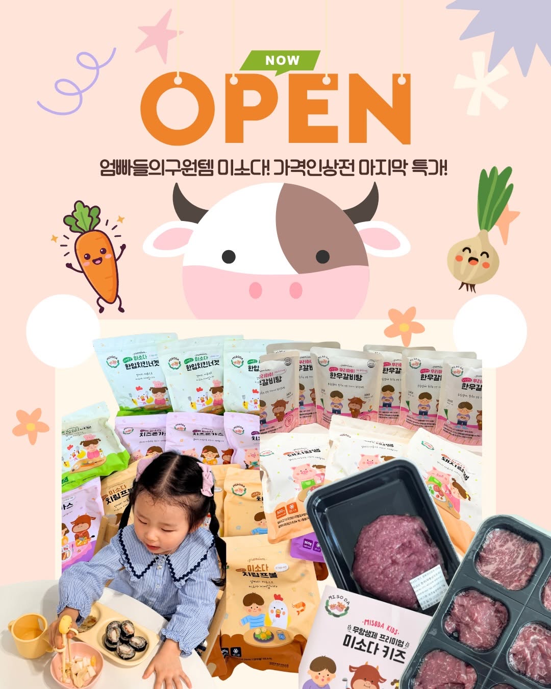 OPEN 돌밥 구원템 미소다 특집 13차 ⭐️롯데백화점 갈 필요 없쥬~? 성분 좋아 맛좋아! 죄책감은 내려두세요ㅠㅠ 우리의 구원템 !!! 리뉴얼되어 컴백합니다🩷🩷🩷 💌[아무댓글] 남겨주시면 지금바로 미리보기링크 디엠전송 드릴게요💚 🌟4/17(금) 오전10시~4/20(월)🌟 ❗️오전10시부터 링크 열려요~🫶🏻 ─────────── 🎁13차 이벤투!! 1️⃣ 사전 예고 댓글 이벤트 👉🏻댓글 또는 기대평 남겨주세요~! 20명 추첨 '세미두콩' 증정! 2️⃣ 구매 인증 이벤트 👉🏻구매 인증 20명 추첨 '한우뿌링 20개입 (4만 2천원 상당 정품)' 증정 갑니돠~!! ─────────── 🥩미소다 고기류 라인업 👉🏻한우&한돈: 깔끔1팩 / 소분6구 ➡️용도별: 다짐육 / 불고기 / 구이류 / 큐브 🧆미소다 반찬시리즈 라인업 👉🏻치림프볼 / 한우랑땡 / 한우볼 / 돼지랑땡(New) 한입치킨너겟 / 한우갈비탕 / 새우랑땡 / 치즈돈까스(New) 🎁반찬시리즈 8종세트 구매시 + 한우갈비탕 1봉더 추가 증정!!(전원) ─────────── ✅이유식 다짐육부터 유아식 구이류까지 전부 무항생제, 잡내안나고 기름기 없이 깔끔-! ✅[대성한우 무항생제 한우시리즈] 👉🏻고기안먹 아기라면 큐브시리즈 강추 👉🏻팬에 오일 살짝 둘러서 안심큐브 또는 채끝큐브 소금간 또는 간장 살~짝 뿌려주면 막 퍼먹어요🥹 👉🏻질기지 않고 부들부들 고기식감은 살아있어서 고기안먹던 울애기 최애랍니다🫶🏻 ✅[미소다 반찬시리즈] 👉🏻백화점까지 안가도됨! 엄빠 반찬하기 지쳤을때, 톡-뜯어서 에프나 팬에 구워주면 반찬한칸 그냥 채워주는 꿀템! ✅[한눈에 보는 대표재료] 🧆한우랑땡, 한우볼 - 무항생제 한우&양파 🧆돼지랑땡 - 무항생제 한돈&양파 🧆한입치킨너겟 - 무항생제 닭안심&당근&양파 🧆치림프볼 - 무항생제 닭안심&새우살 🧆새우랑땡 - 삼치&새우살 🧆치즈돈가스-한우,한돈,모짜렐라 치즈 🍲한우갈비탕-무항생제 한우&대파&무 *그 외 재료는 제품 뒷면 또는 상세페이지에서 확인가능 *노계란/노화학첨가물 〰️〰️〰️〰️〰️〰️ 냉장류 자사몰, 스마트스토어는 이미 인상되었대요ㅠㅠ 인상전 다겨미네 최저가로 올게요😎 🚚배송 *육류: 오후1시건 바로배송 (주문많을시순차배송), 배송비3500원 *반찬류: 오후 12시 주문건 바로배송 5만원 이상 무배, 배송비 4000원 *제주도 배송가능 *반찬류와 한우&한돈은 합배송 불가 ✅소비기한 (전부 최신제조) 한우랑땡 - 2027-03-12 한우볼 - 2027-03-11 돼지랑땡 - 2027-02-03 갈비탕 - 2027-03-08 새우랑땡 - 2027-03-09 치킨너겟 - 2027-03-29 치림프 - 2027-04-02 치즈돈가스 - 2027-04-02 📱고객센터 미소다 카톡플친문의 #미소다