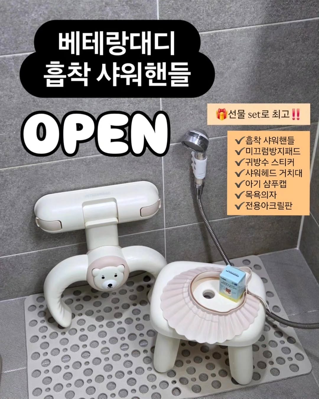 #공구오픈 #베테랑대디샤워핸들 하 ... 첨부터 이런 걸 썻어야했어요 ... 릴리가 조금씩 서있기 시작하면서 구매한 것 중 하나가 바로 샤워핸들이었는데요😂 기존에 쓰던 발판있는 제품ㅠㅠ 부피가 너무커서 치우고 옮기고 ; 진짜 씻길때마다 번거롭구 힘들더라구요 더 최악인 건 물때가 그대로 끼이는 (특히 응가💩 ... 😱) 아주 스트레스받는 상황이 생겨 경악을 금치 못하고 구석에 박아두었네요 다시 요거로 구매한 릴리맘이 한번에 사기 딱 좋은✨️ 구성으로 ( 전구성은 선물셋트처럼 포장까지🎁 ) 가격은 착하고 , 구성은 알차게 데려왔습니다🩷♥️🩷♥️ 신세계를 경험시켜 줄 아이예요 💫 ---------------------- 🗓 공구일정 4/1 - 4/5 📍구성 (개별구매도 가능) - 샤워핸들 - 샴푸캡 - 미끄럼방지매트 - 의자 - 샤워홀더 - 귀 방수스티커 ------------------ 진공흡착 + 잠금레버라 붙이면 떨어질 일❌️ 바닥면이 없는 구조라 물때 걱정도❌️ 샤워도하고, 응아 닦아줄 때도 사용하니 하루에 몇번씩 쓰게 될 때도 많은데 바닥면 있는 샤워핸들을 왓다갓다 .. 너무 불편하잖아요😭 베테랑 대디 샤워핸들은 사용하지않을 땐‼️ 바로접어서 보관, 공간차지❌️ 곰돌이 모양은 누르면 뿅뿅💛 소리도나서 후다닥 목욕시키기에도 너~무 좋은 아이템이랍니당🐻💛 ♥️안전 + 실용성 + 합리적인가격♥️ 저처럼 이중ㅠ돈 쓰지마시구 첨부터 요런 걸로 겟하셔서 돈아끼세요✌️