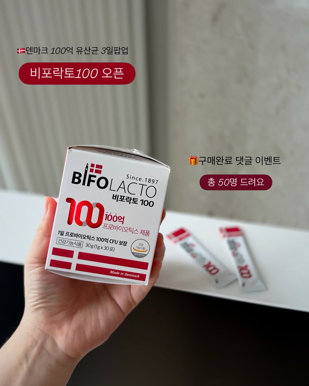 🎁구매완료 댓글 이벤트피드 입니다💛 비포락토100구매후 구매완료 댓글 남겨주신분 대상으로 비포락토 100 1통씩 더 보내드려요😊 총 50명 선정할게요💛 ✔️공구 품목 비포락토100 ✔️공구 일정 4/27 오전10시 오픈, 3일만 진행합니다. ✔️공구 품목 설명 ✅비포락토 100 - 100억균주 LGG+비피더스 균주 - L.rhamnosusGG 를 필두로 BIFOLAC12라고 하는 가치있는 비피도박테리움 균주만 담은 특별한 균주 배합 - 120년 유산균만을 제조한 BIFODAN사가 직접 제조해서 덴마크 완제 수입 유산균 - 24개월 이후부터 전 연령 고려 가능 (24개월 이전도 적극 섭취 목적이라면 섭취가능)