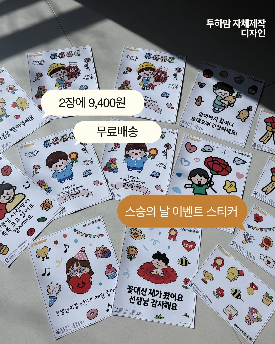 [공구오픈] 2장에 9,400원 무료배송! 투하맘 단독 스티커 💌 구매를 원하시면 댓글에 ‘링크’ 남겨주세요 구매하실 수 있는 링크 DM으로 바로 보내드릴게요! 🎁 선착순 이벤트 구매해주신 선착순 20분께는 데코 스티커 1장을 추가로 더 넣어드릴게요❤️ 5월은 무슨 달? 바로 행사의 달이죠🎁 어버이날에 스승의날까지, 챙겨야 할 마음은 많은데 막상 선물 고르려니 벌써 머리 아프지 않으세요? 특히 요즘은 어린이집, 유치원 모두 스승의날 선물을 받지 않는 곳이 많아서 더 조심스럽고, 또 더 고민되더라고요🥲 근데 그냥 지나가긴 아쉽고 감사의 마음은 꼭 전하고 싶어서 투하맘이 직접 만들었어요💛 ✔ 스승의날 스티커 ✔ 할머니·할아버지 감사 스티커 ✔ 생일 주인공 스티커 ✔ 어디에서도 못 보는 투하맘 단독 디자인 무려 30종 이상! 상황에 맞게, 취향에 맞게 예쁘게 골라 담아보세요💛 작은 스티커 하나지만 우리 아이의 하루를 더 특별하게 만들어주고, 받는 분의 마음에도 기분 좋은 미소를 남길 거예요! 게다가 가격도 부담 없게 준비했어요❤️ 2장에 9,400원, 무료배송❗️ 조동이랑 수량 맞추고 공구할 필요 없이 딱 2장만 골라도 무료배송으로 가볍게 받아보실 수 있어요✨ 이번 5월, 부담스러운 선물보다 센스 있고 따뜻한 마음을 전하고 싶다면 투하맘 스티커 공구에서 함께 준비해보세요💛 ㅡㅡㅡㅡㅡㅡㅡㅡㅡㅡㅡㅡㅡㅡㅡㅡㅡㅡㅡㅡㅡㅡ 📢 공구 기간 | 4월 17일(금) ~ 4월 20일(월) 📌 프로필 링크에서 구매 가능!